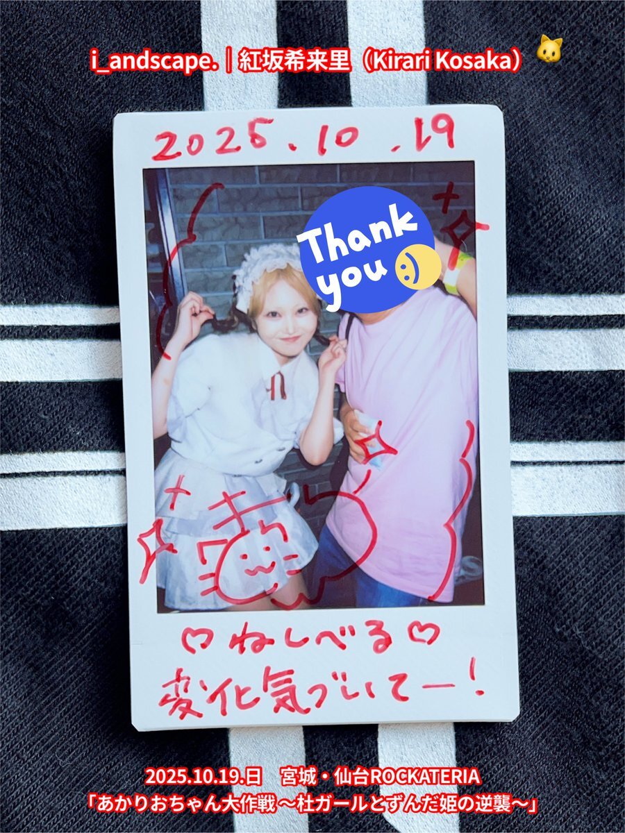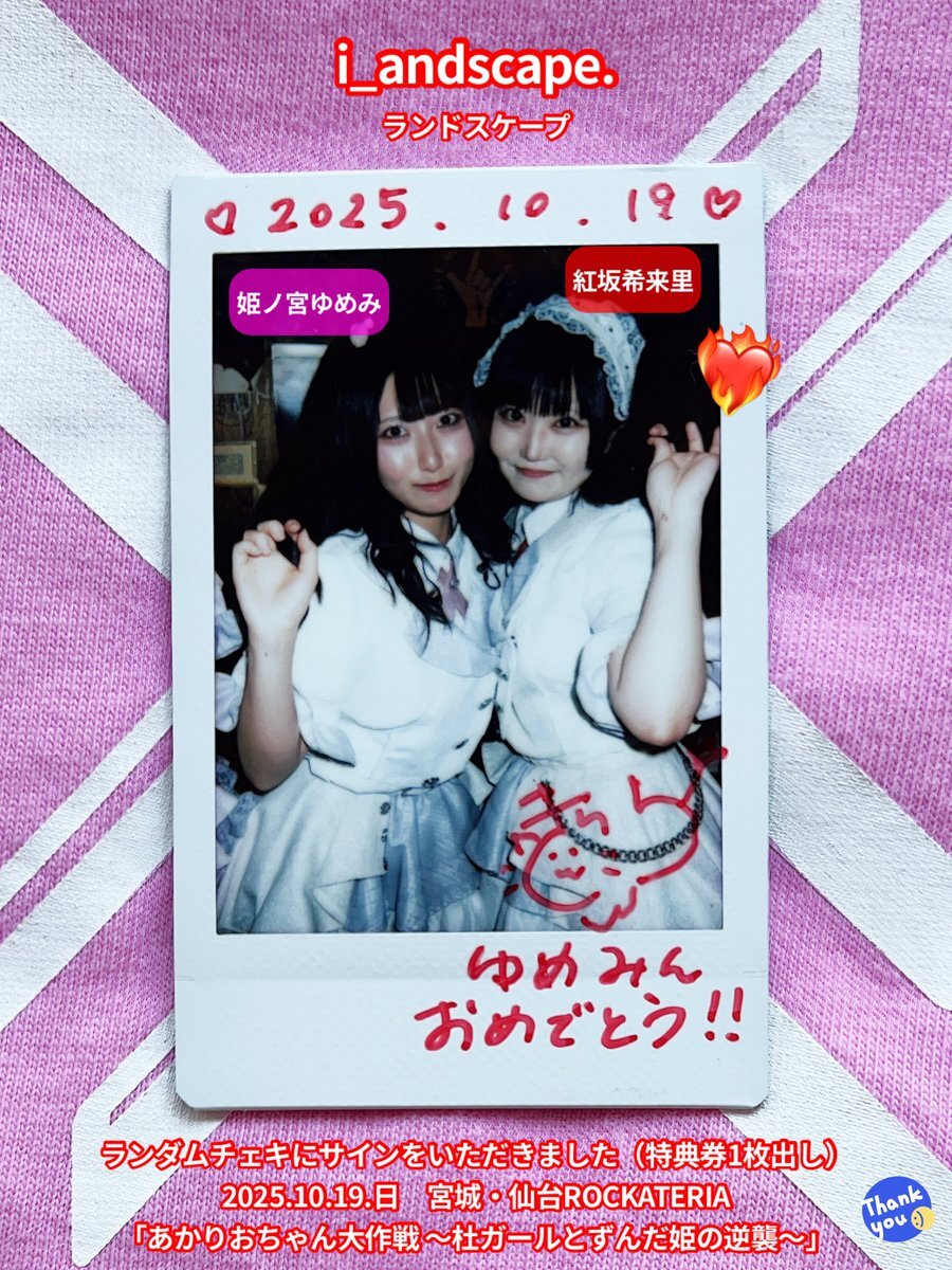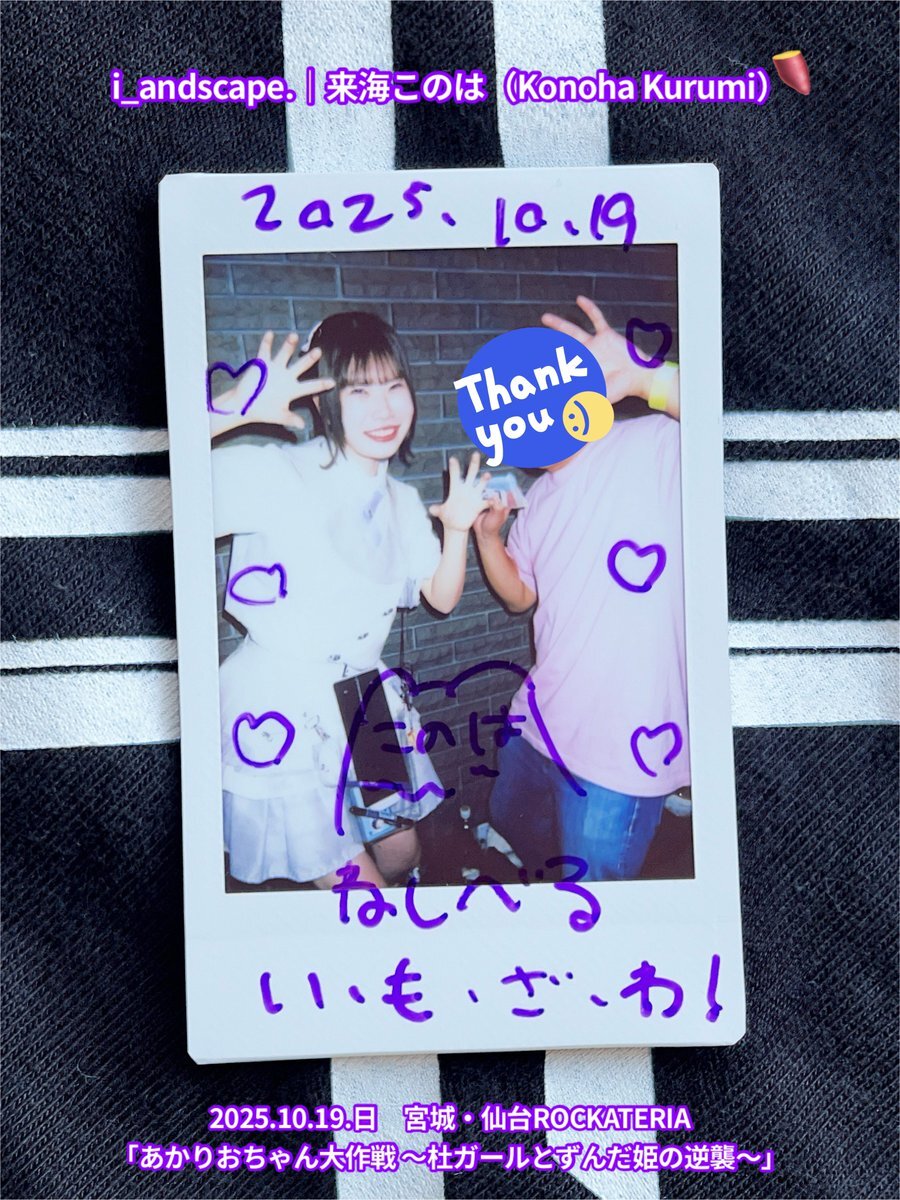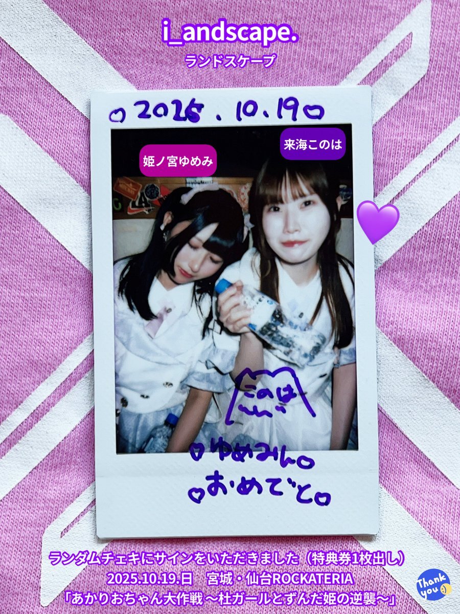 2025.10.19.日 #チェキ 2/3 仙台ROCKATERIA♬2ステージ 『あかりおちゃん大作戦』 『せんだいのともだち』 #i_andscape #来海このは #ほくほくこのは 💜 #紅坂希来里 #とっとこきらり ❤️🔥 #姫ノ宮ゆめみ #ゆめみ本日の猪突猛進 💖 このはー💜✨ きらりー💖✨ 💖ゆめみんへのサインありがとう☺️ pic.x.com/x70Hbv30Tw x.com/i_andscape/sta…