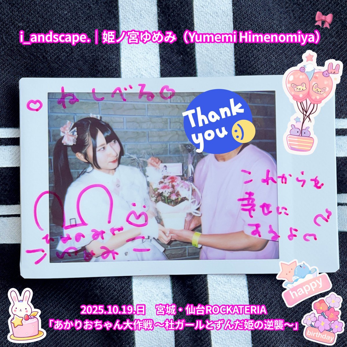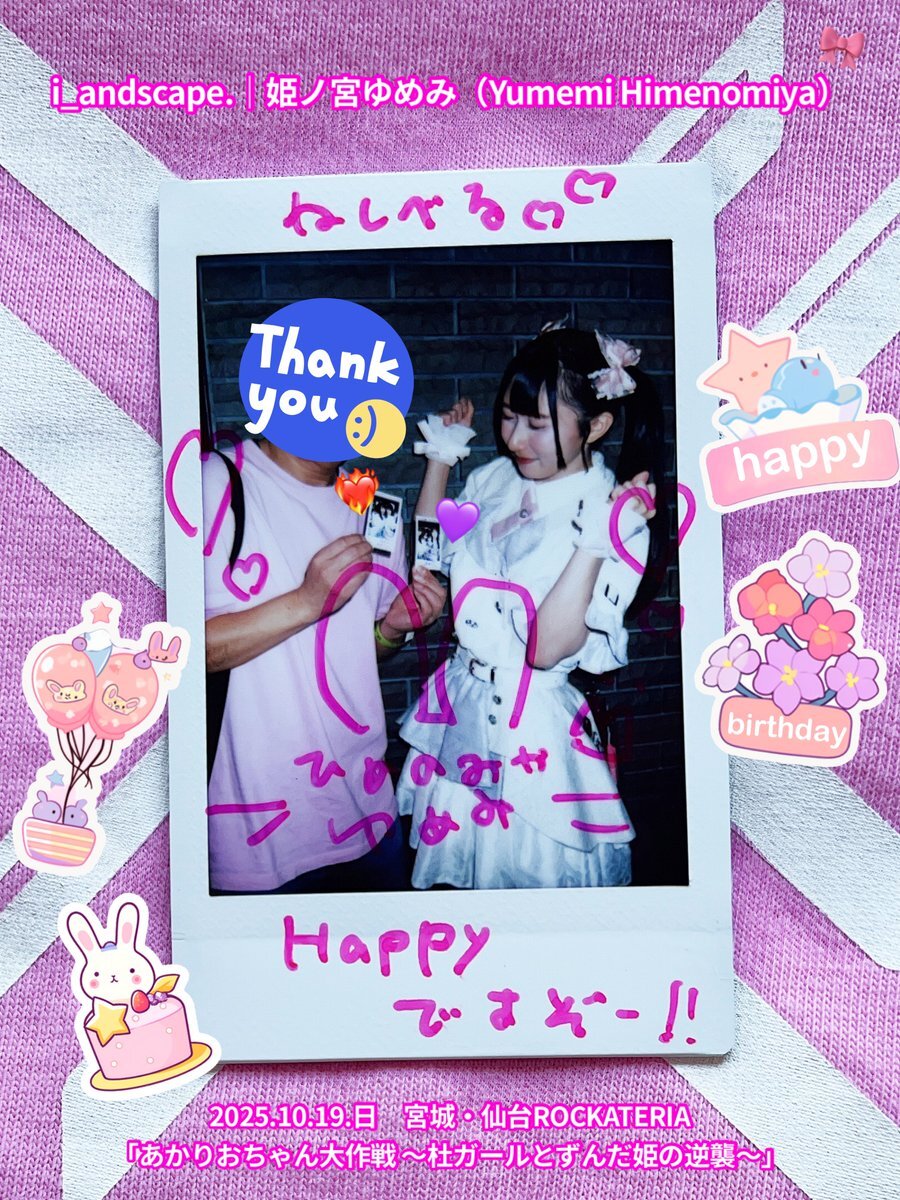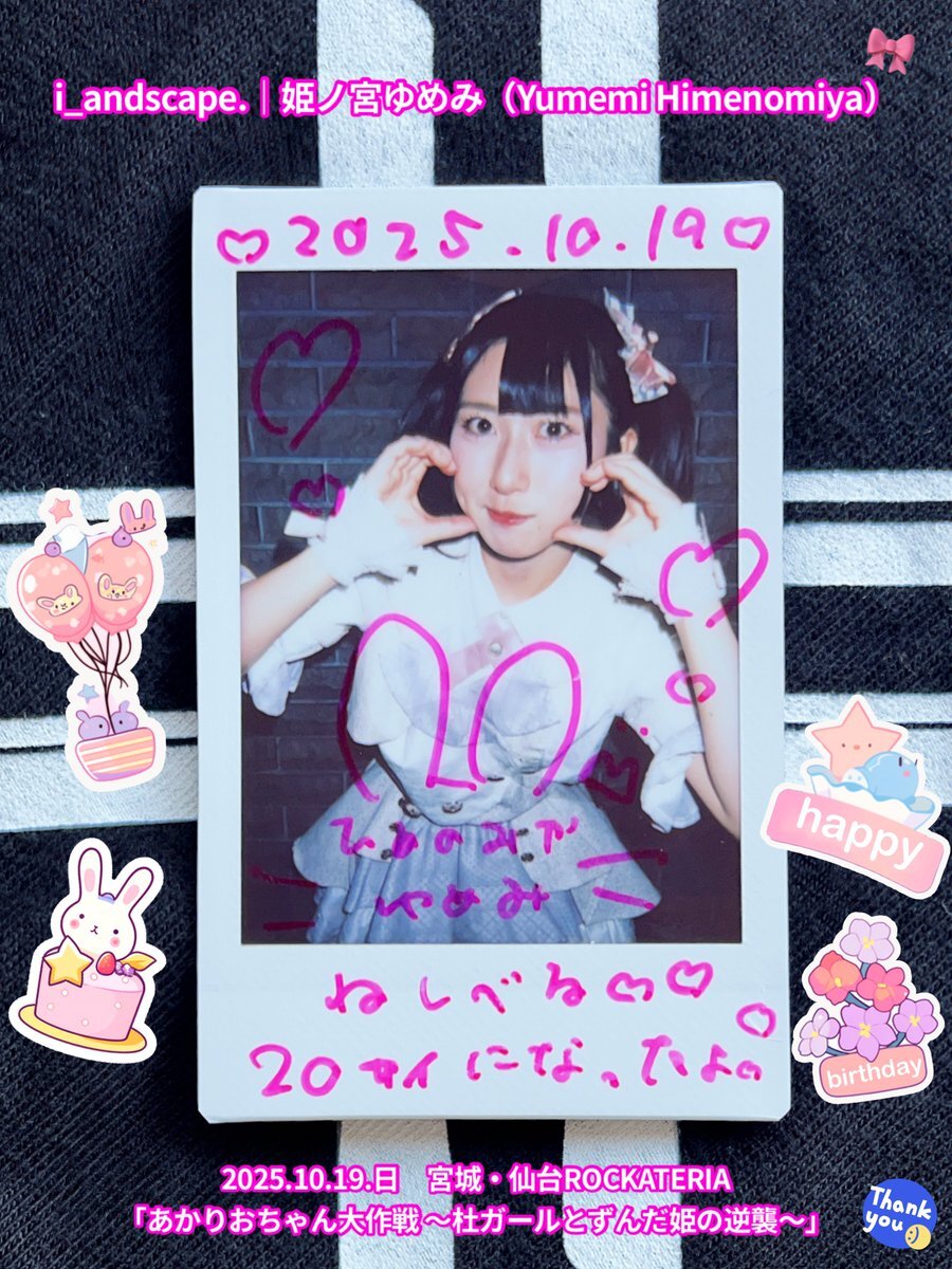 2025.10.19.日 #チェキ 1/3 仙台ROCKATERIA♬2ステージ 『あかりおちゃん大作戦』 『せんだいのともだち』 #i_andscape #来海このは #ほくほくこのは 💜 #紅坂希来里 #とっとこきらり ❤️🔥 #姫ノ宮ゆめみ #ゆめみ本日の猪突猛進 💖 #仙台 #アイドル #仙台アイドル \✨ゆめみん♡二十歳リアバ✨/ pic.x.com/bpht9cnQbV x.com/i_andscape/sta…