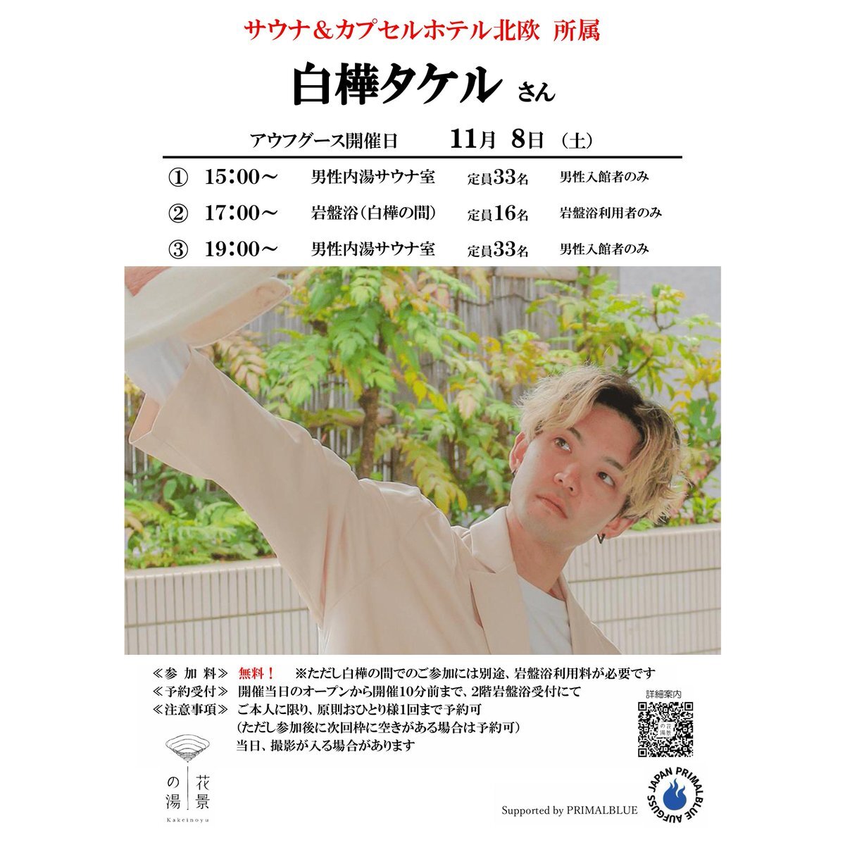 花景の湯ゲストアウフグースイベント 白樺タケル (サウナ北欧) 15:00 男性サウナ 17:00 白樺の間 19:00 男性サウナ ※白樺の間の開催のご予約はお早めに! #hanabiyori #花景の湯 #サウナ #アウフグース #サウナイキタイ #サ活 #ととのう #primalblue #白樺タケル pic.x.com/dPF5Hfn2NX