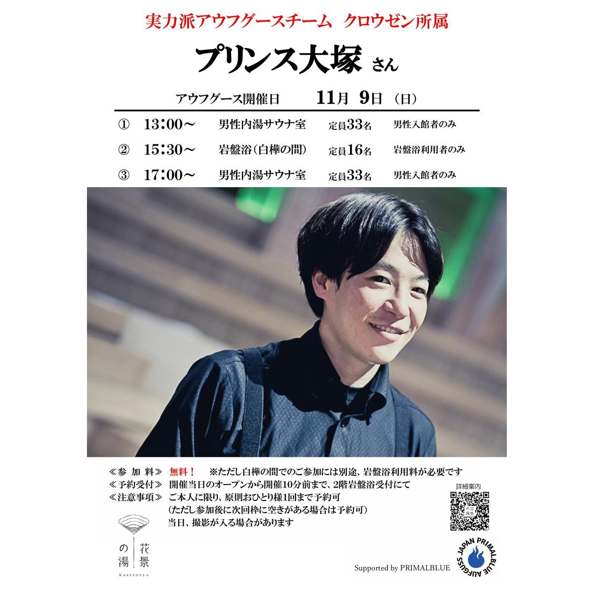 花景の湯ゲストアウフグースイベント 11/9(日) プリンス大塚さん (クロウゼン) 13:00 男性サウナ 15:30 白樺の間 17:00 男性サウナ ※白樺の間の開催のご予約はお早めに! #hanabiyori #花景の湯 #サウナ #アウフグース #サウナイキタイ #サ活 #ととのう #primalblue #プリンス大塚 pic.x.com/W3Fq0pfQky