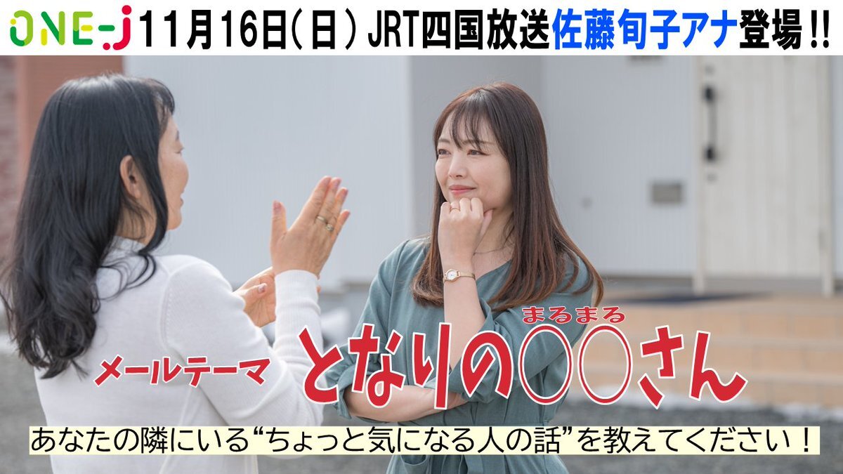明日11/16(日)朝8時の #onej 徳島・JRT四国放送の佐藤旬子アナ登場✨ メッセージテーマは… となりの○○さん ●電車で隣に座った人の忘れられない言動 ●隣の部署の気になる新人さん など 身近なちょっと気になる人の話を教えてください🥰 採用されたら番組ステッカー🎁 宛先はonej@onej.jp✉
