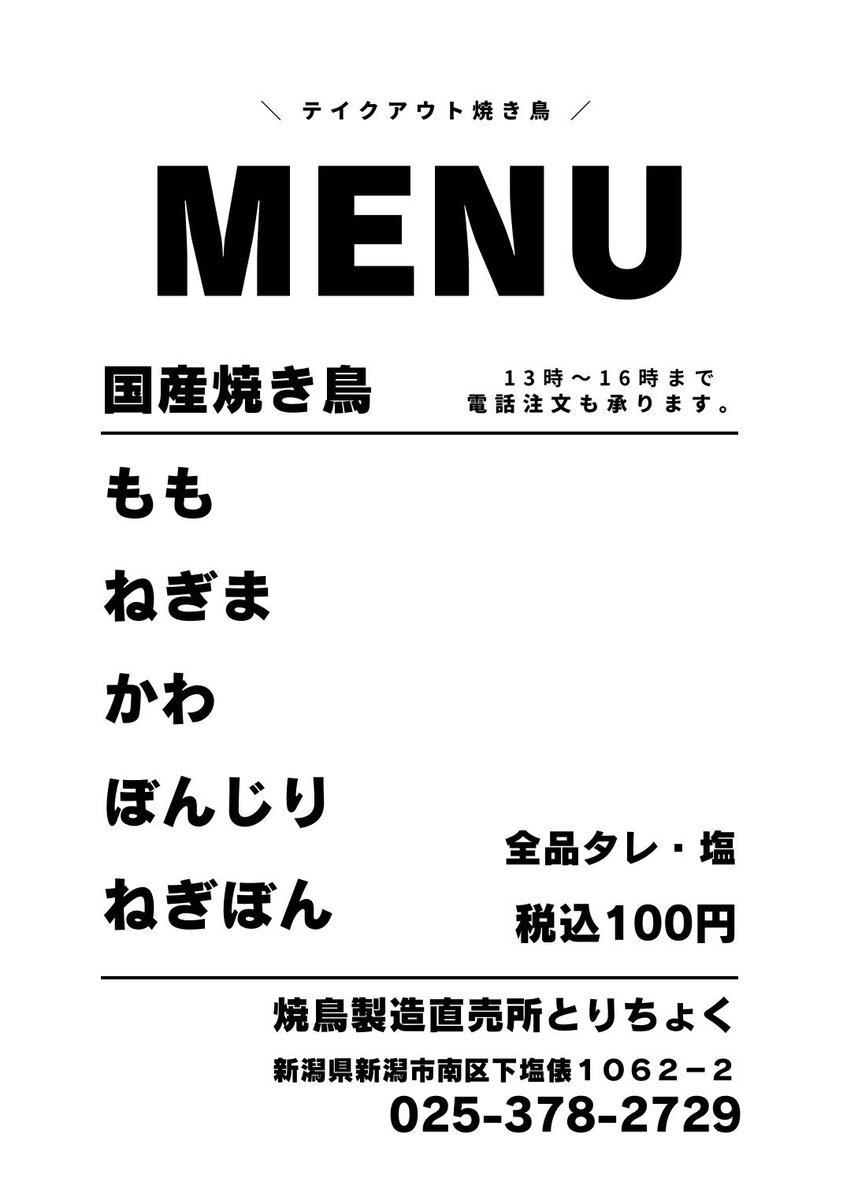 本日通常通り営業しますが、人員不足のため土曜日限定塩唐揚げはお休みいたします。 ご迷惑おかけします🙇 #とりちょく #焼鳥 #やきとり #冷凍焼鳥 #冷凍食品 #塩唐揚げ #新潟市南区 #白根 pic.x.com/9pKPPTWOxY