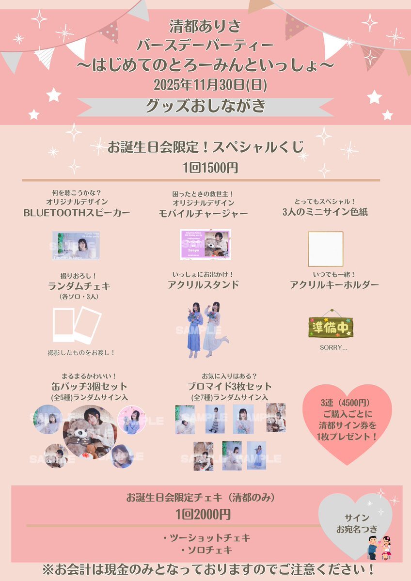 🌸11/30(日)の誕生日イベントお品書き🌸 スペシャルくじのサイン色紙とランダムチェキはかえでし、にししのご協力もいただけてお2人のもご用意あります!✨ グッズすっごい気合い入れて作ったよ🥳 1点ものも多いのでぜひ手に取っていただけると嬉しいな🫶 #とろーみん #とろーみんといっしょ pic.x.com/lf3QudCiAH