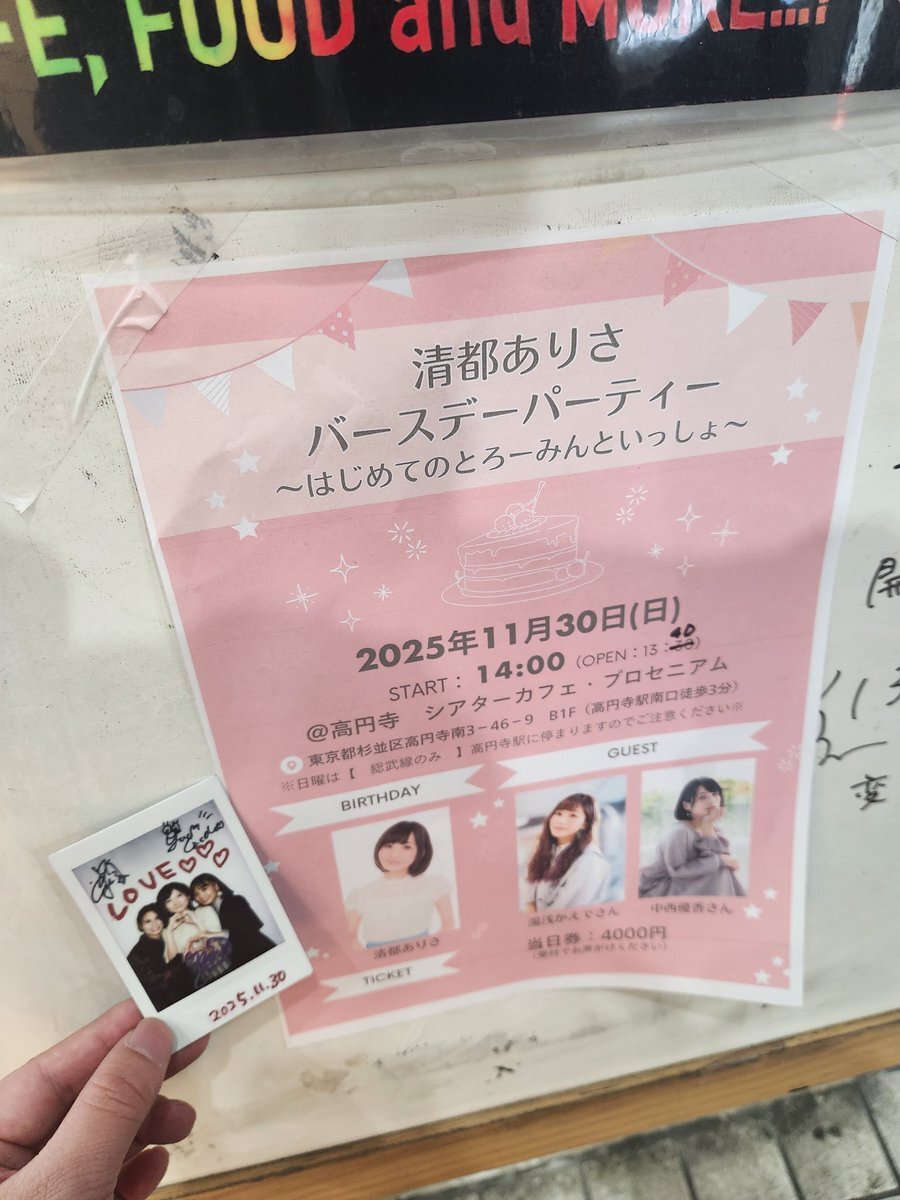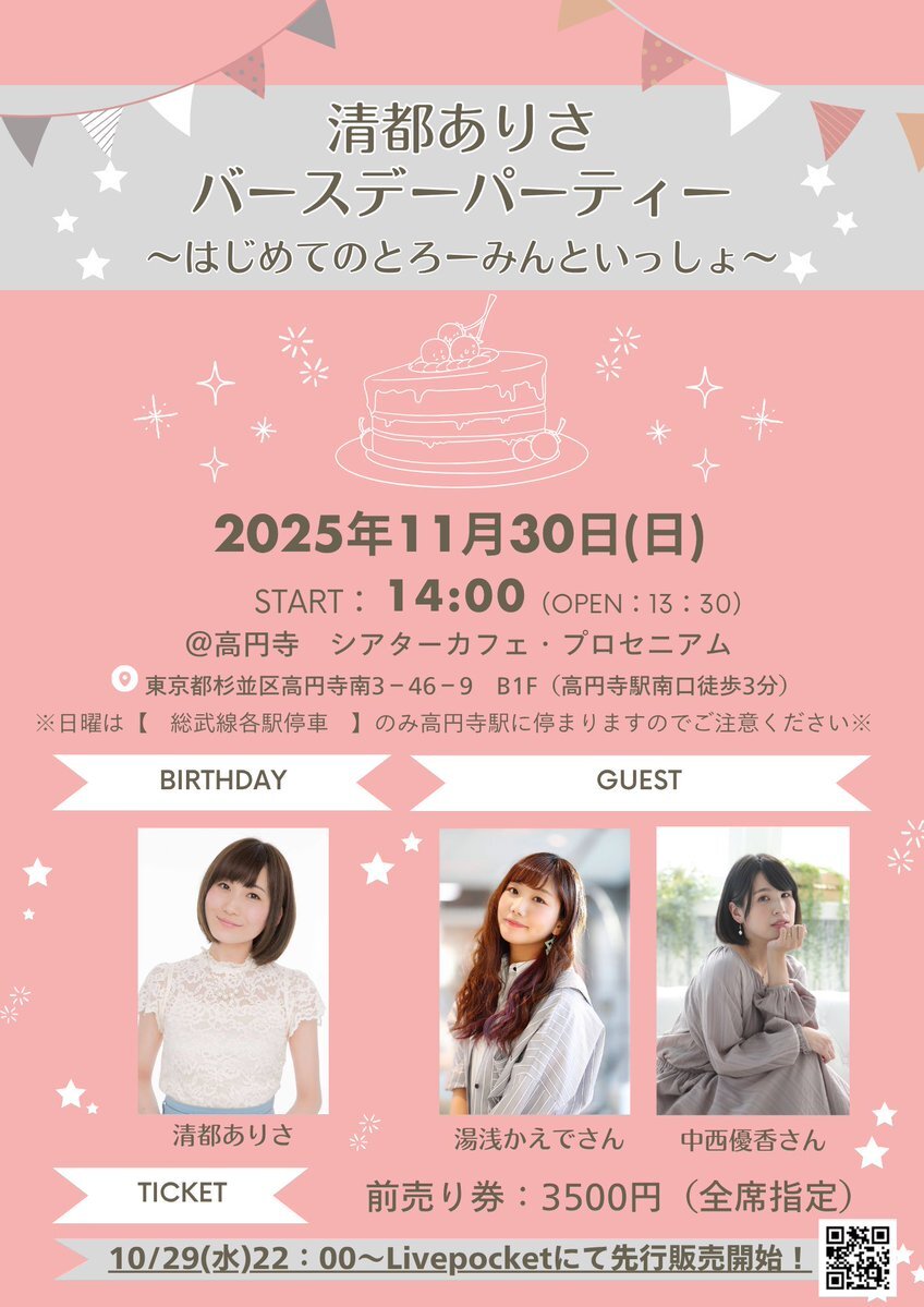 🌸初の誕生日イベント開催します🌸 💐清都ありさバースデーパーティー💐  〜はじめてのとろーみんといっしょ〜 ゲスト:湯浅かえで、中西優香 11/30(日)14時〜 高円寺シアターカフェプロセニアム 前売:3,500円 ぜひ遊びに来て下さい❤︎ 10/29(水)22時〜先着販売開始🎟️ livepocket.jp/e/5f506