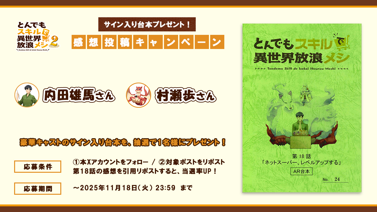 『#とんでもスキルで異世界放浪メシ 2』 ✨🎁台本プレゼントキャンペーン🎁✨ 『#とんでもスキルで異世界放浪メシ 2』、第18話放送を記念し、 #内田雄馬 さん #村瀬歩 さん サイン入り台本を1⃣名様にプレゼント! 🥩応募方法✨ ☑︎本アカウントをフォロー ☑︎この投稿をリポスト