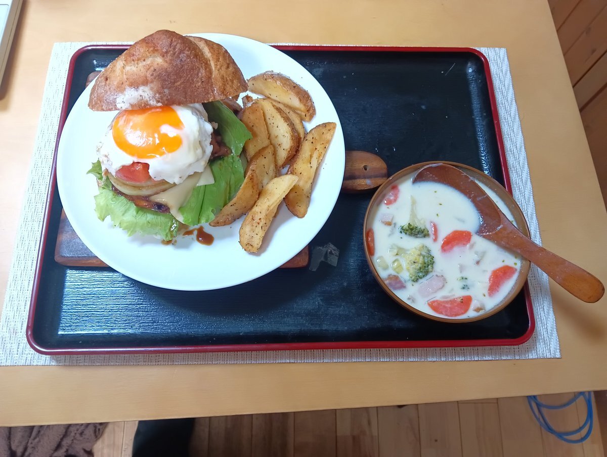 盛った具が安定せず撮ったらすぐ崩れた…旗が無いから? テリヤキバーガーは嫌いだがテリヤキチキンは好きなので再現…だが手間だった。 寒いし豆乳スープも一緒に再現… バーガーに比べ胃だけでなく手間も片付けも優しいわ #とんでもスキル再現料理 #とんでもスキル #とんでもスキルで異世界放浪メシ2 pic.x.com/nuGRZXX3Zt