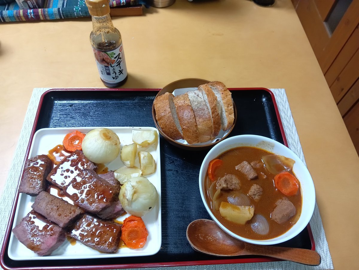 ローストドラゴンの作り方焼き加減ムズ。普段焼き目付けてお湯漬けて作ってるから…今後は普段の作り方だなやっぱ 食パン昨日消費したが月見バーガーの時のパン残ってたから消費用にビーフシチュー再現。 漸くパン終えた #とんでもスキル再現料理 #とんでもスキル #とんでもスキルで異世界放浪メシ2 pic.x.com/4ZJfYfYnJ4