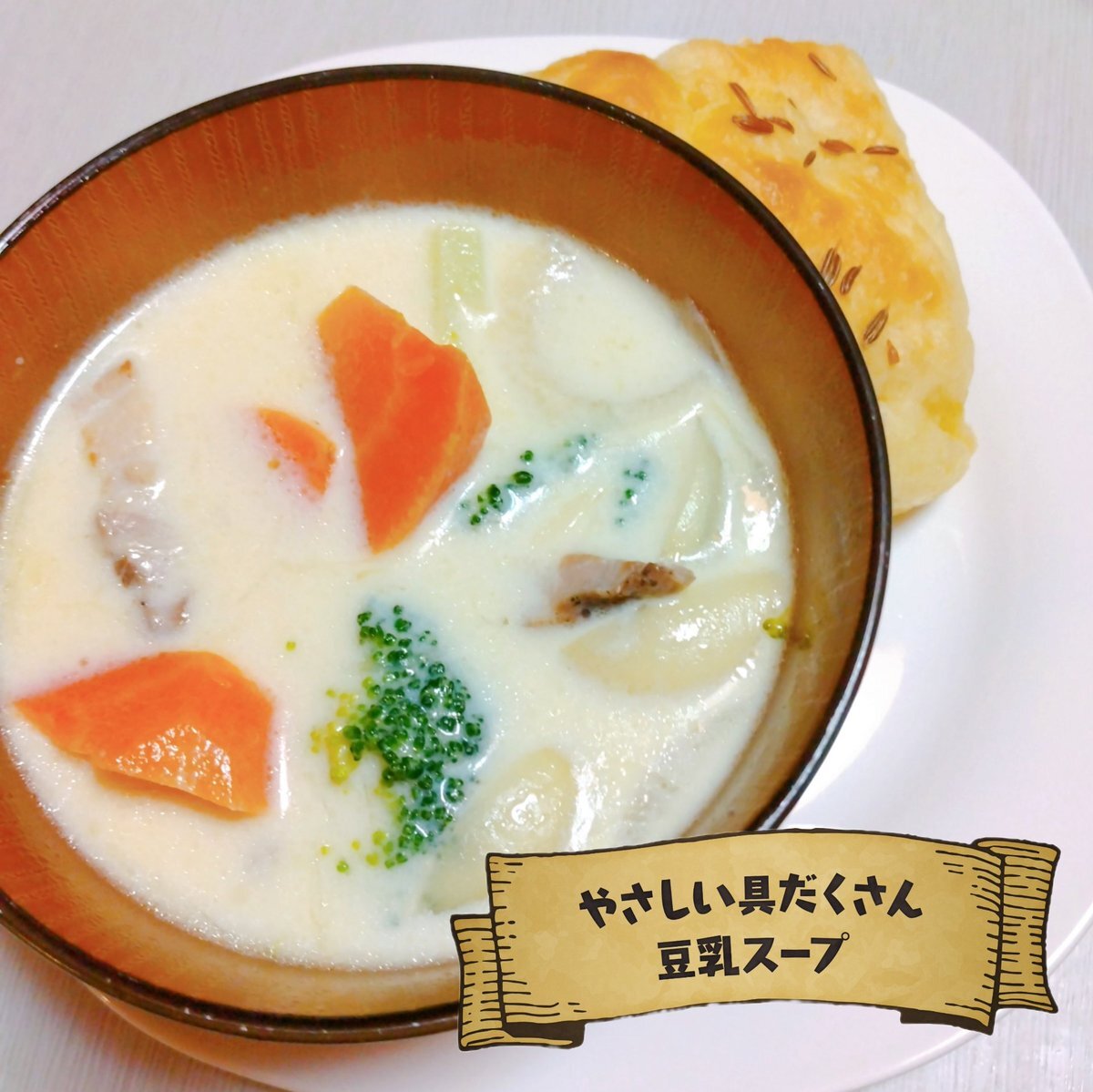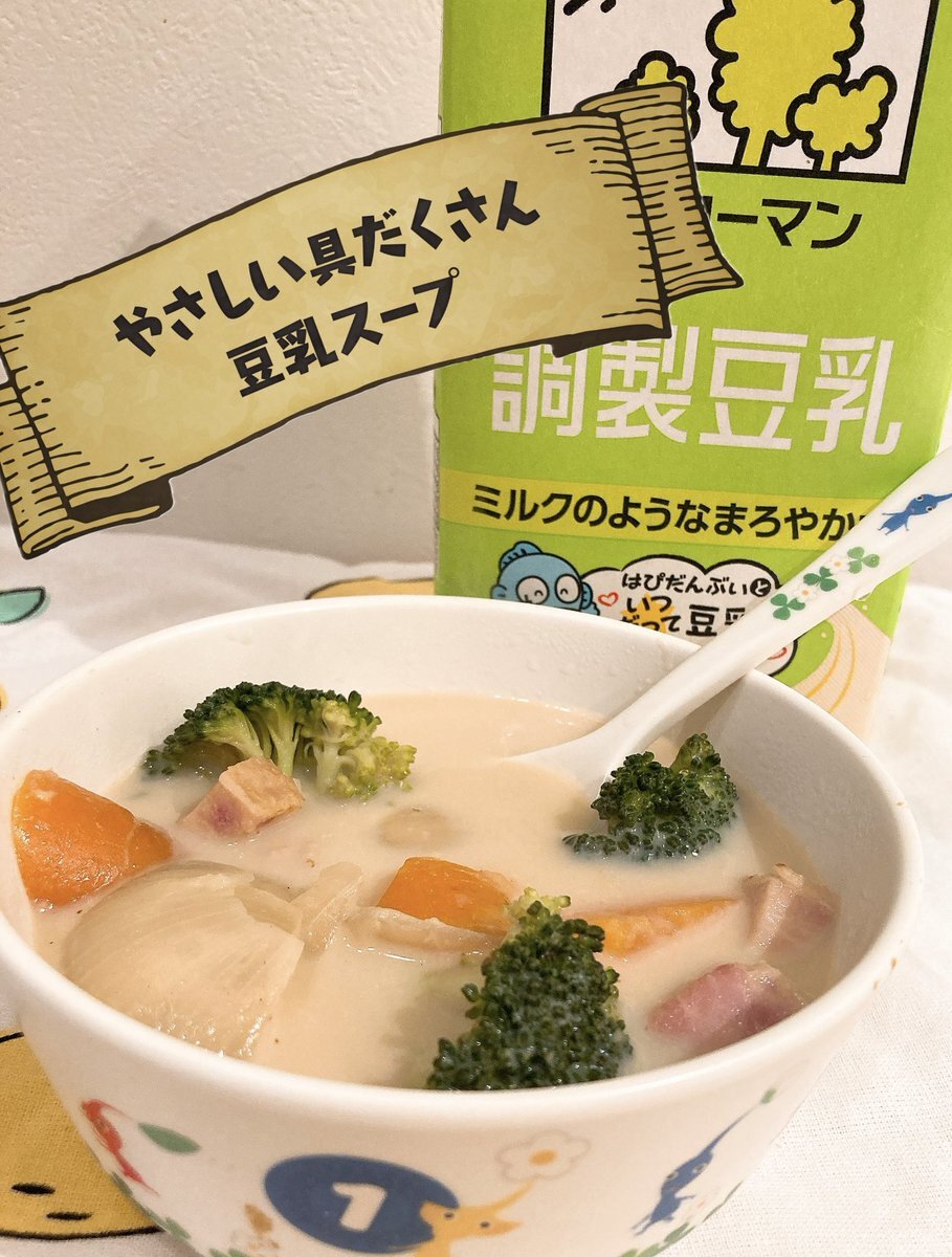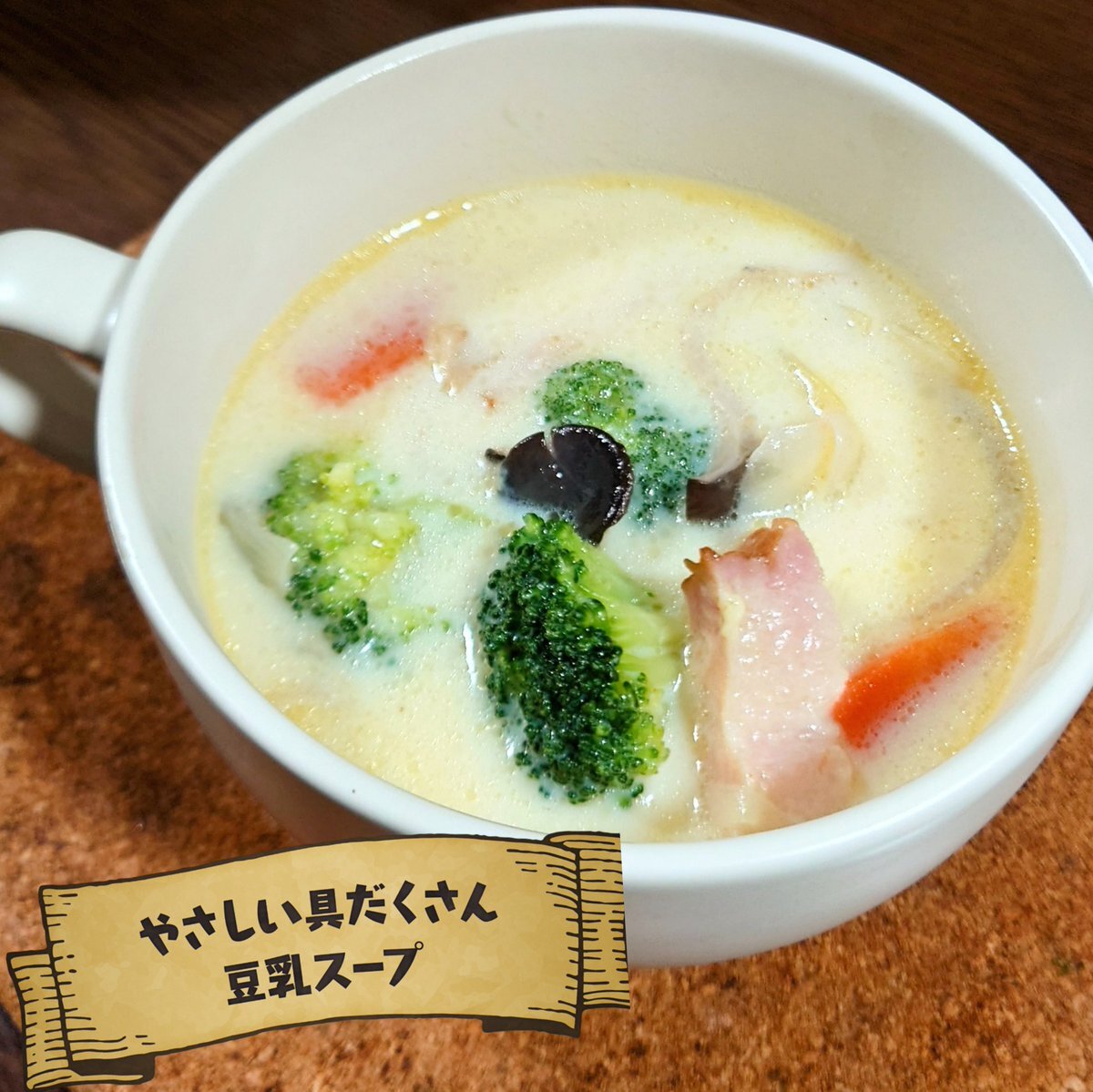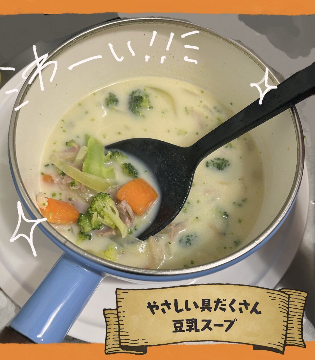 豆乳スープ作ったー、豆乳あんまり好きじゃないんだけど、なかなか食べ応えがあって良かった #とんでもスキル再現料理 pic.x.com/NvQoY17C5T