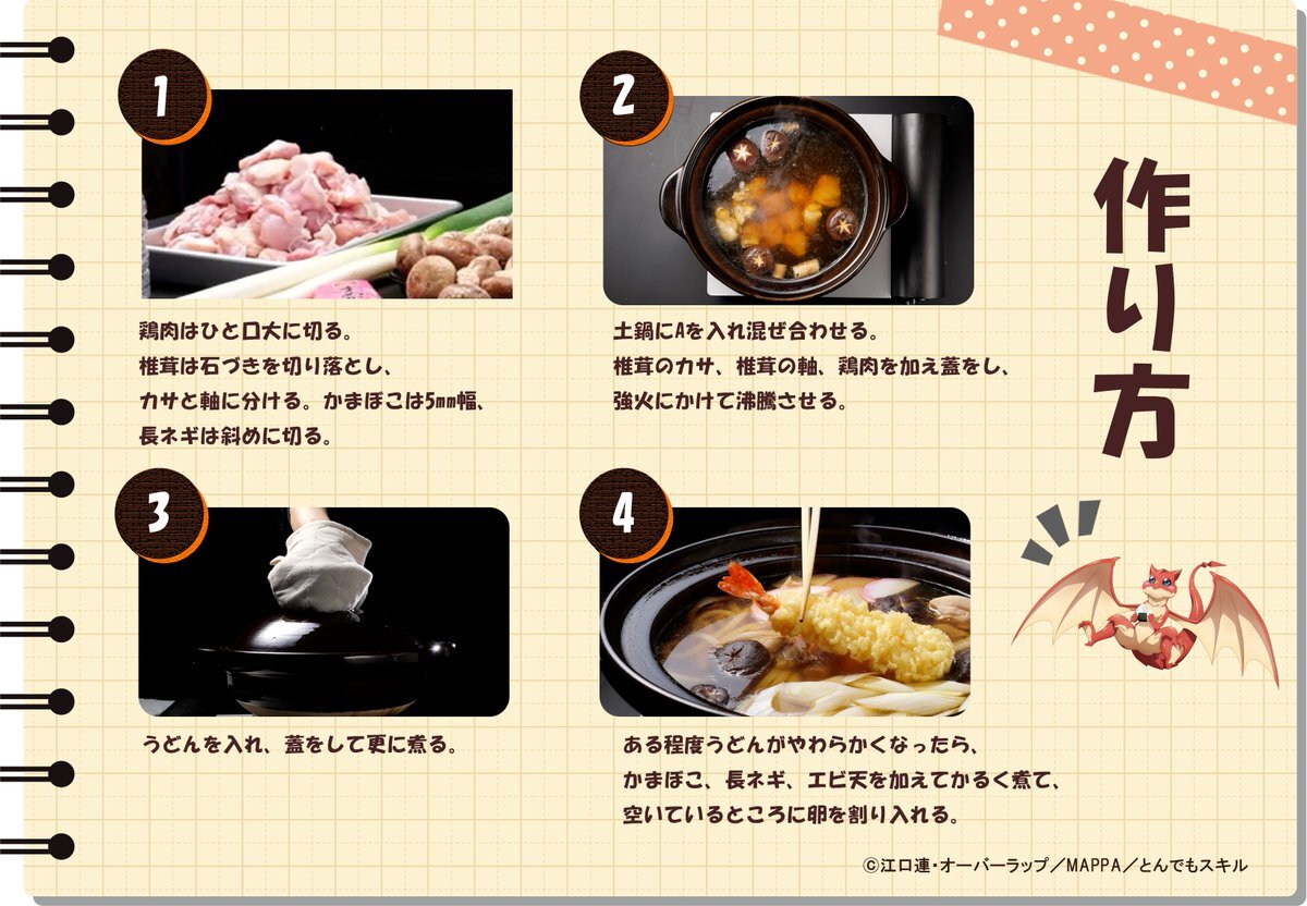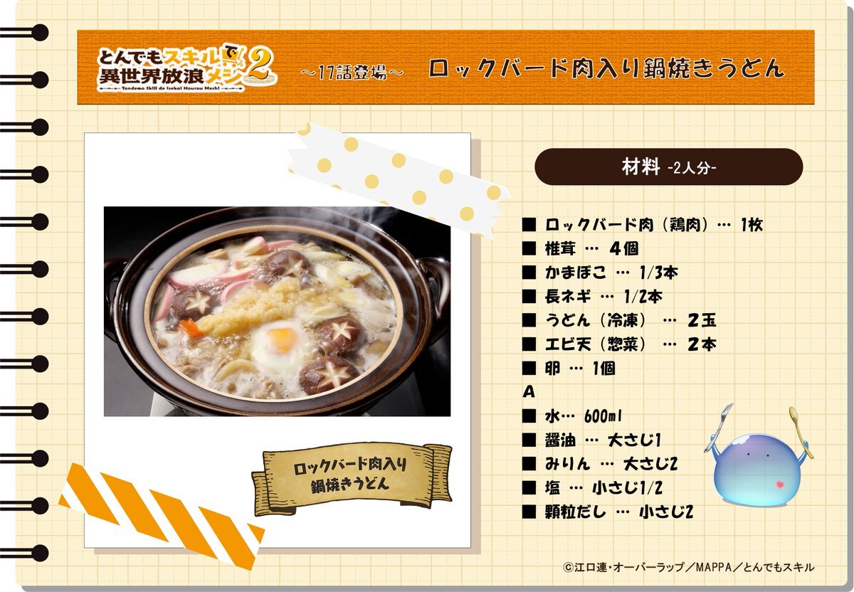 //    #とんでもスキル再現料理 チャレンジ🍳🔥 \\ #とんでもスキル 17話に登場した 「ロックバード肉入り鍋焼きうどん」レシピを クックパッドで公開‼️ みなさんもぜひ作ってみてください♪ 🔽レシピはこちら cookpad.com/jp/recipes/251… 宣伝スタッフも毎週 #スイ曜日 にチャレンジしてみます! pic.x.com/Ouh4WViDE4