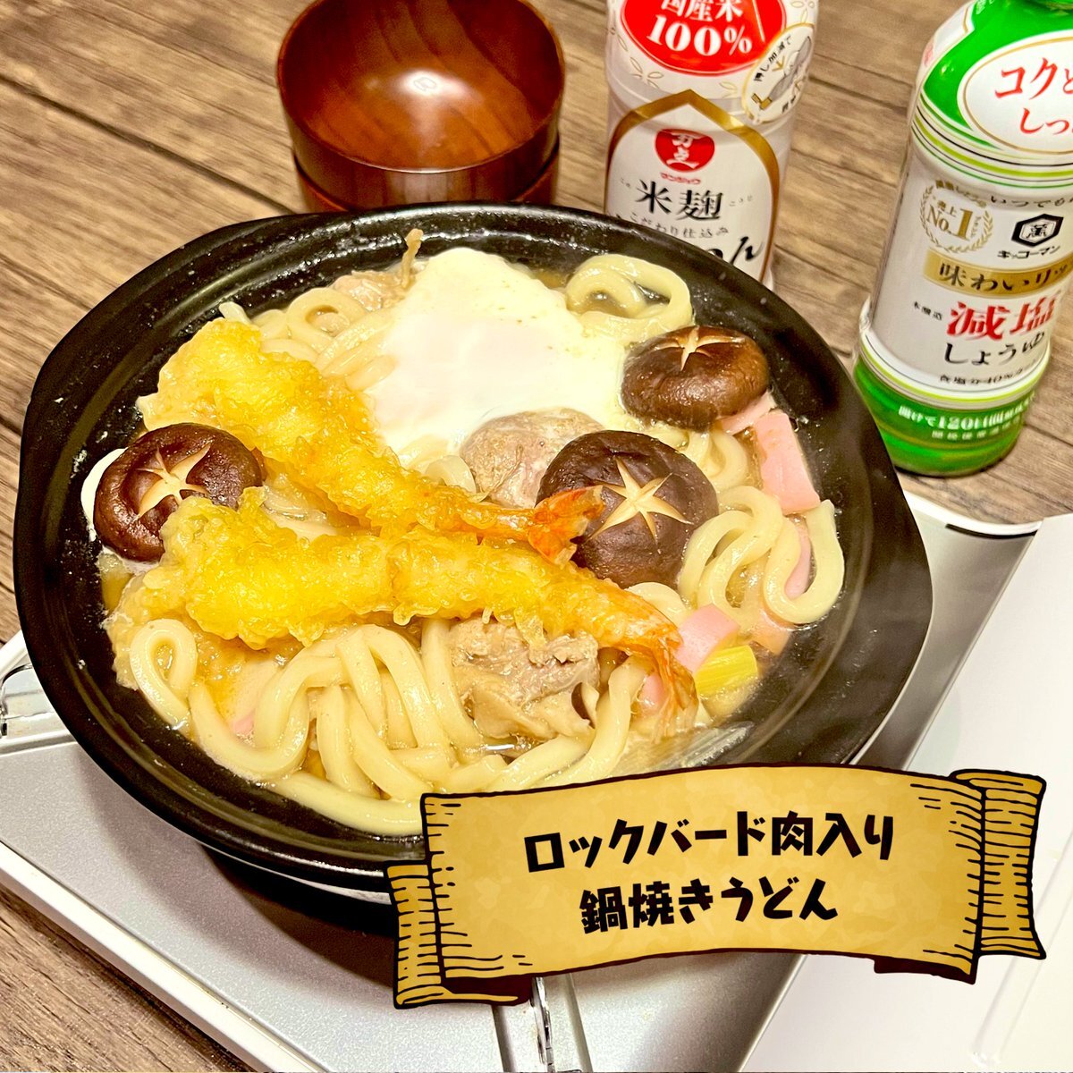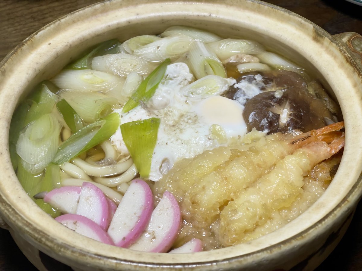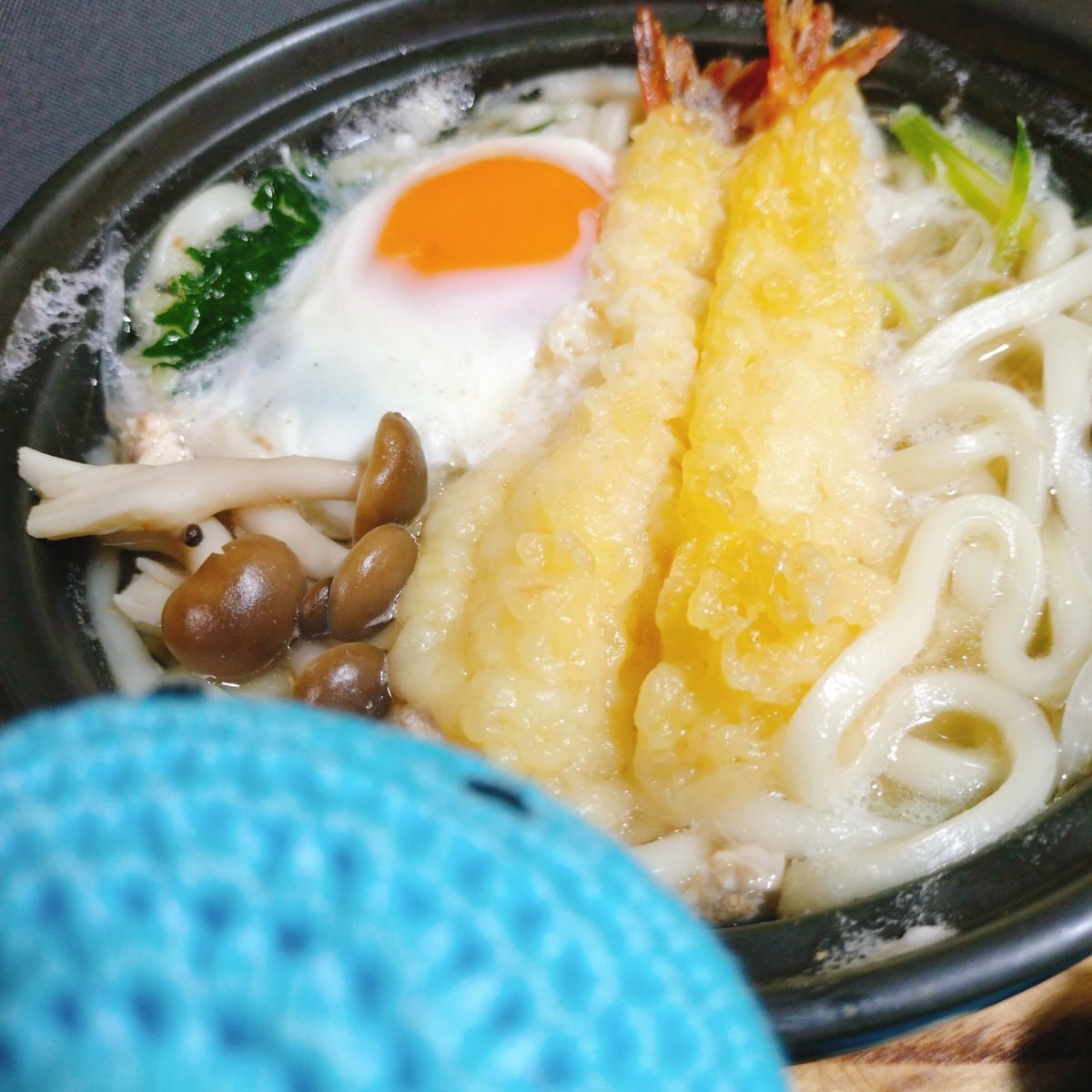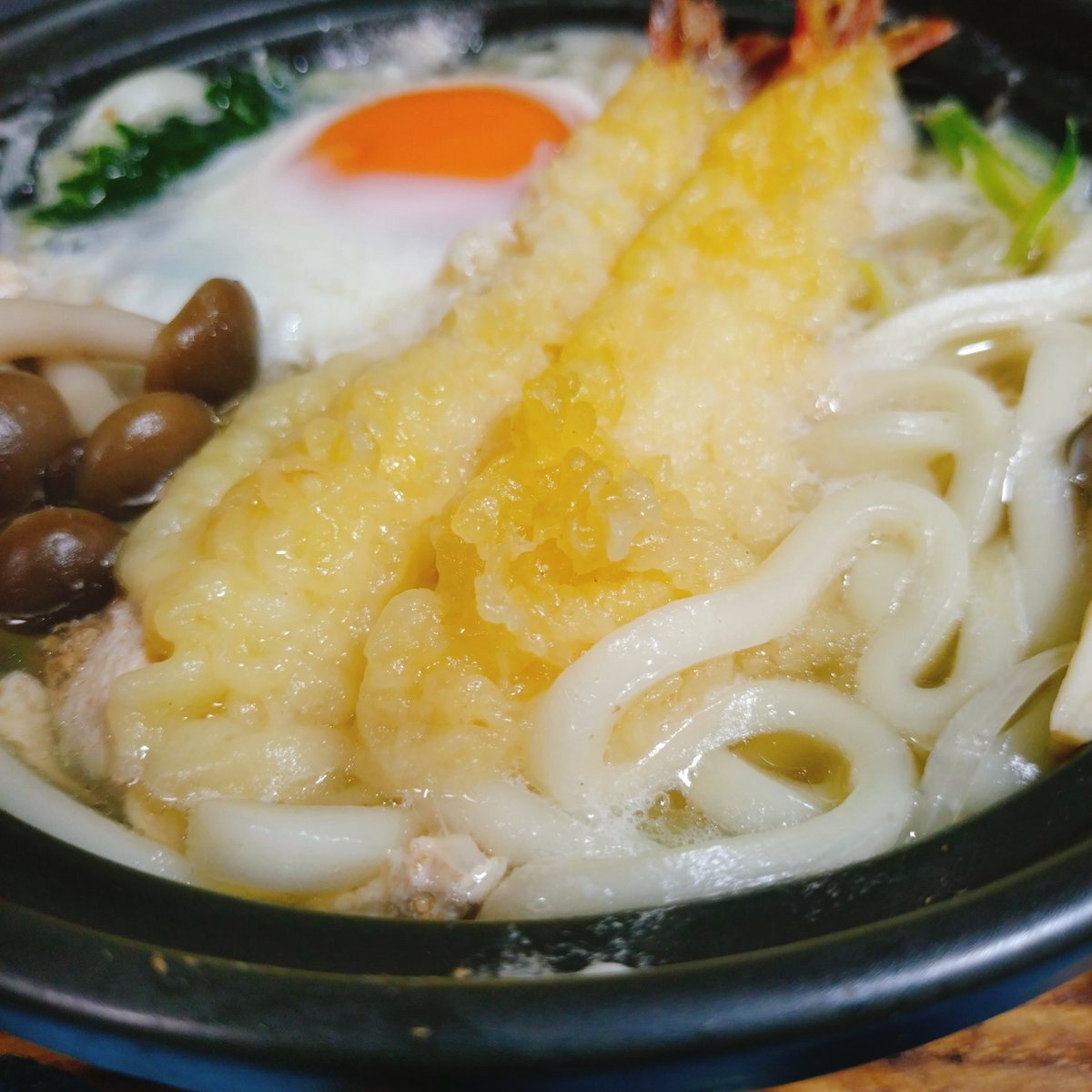 HbA1c、6.0!ちょっとあがったけど圏内!! 鍋焼きうどんだーー!!そぎ切りしたロックバードが柔らか!!出来合い🍤🍤エビ天うまー! でも鍋の蓋どっかいったーー!!どこなおしたろか? #とんでもスキル再現料理 pic.x.com/G9FUaY4DS1
