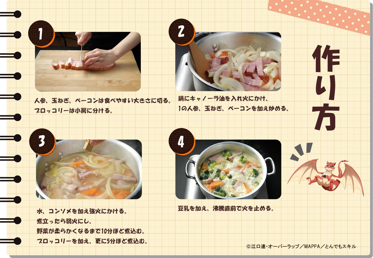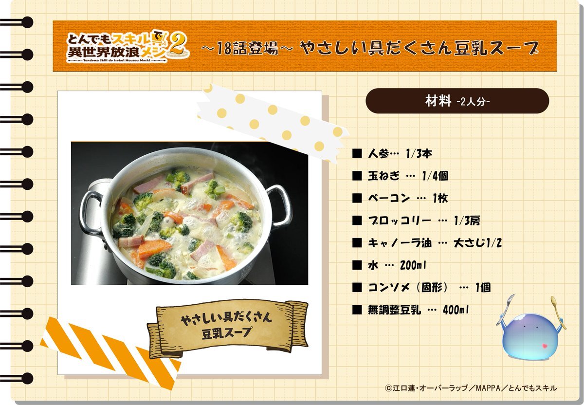 //    #とんでもスキル再現料理 チャレンジ🍳🔥 \\ #とんでもスキル 18話に登場した 「やさしい具だくさん豆乳スープ」レシピを クックパッドで公開‼️ みなさんもぜひ作ってみてください♪ 🔽レシピはこちら cookpad.com/jp/recipes/251… 宣伝スタッフも毎週 #スイ曜日 に チャレンジしてみます!