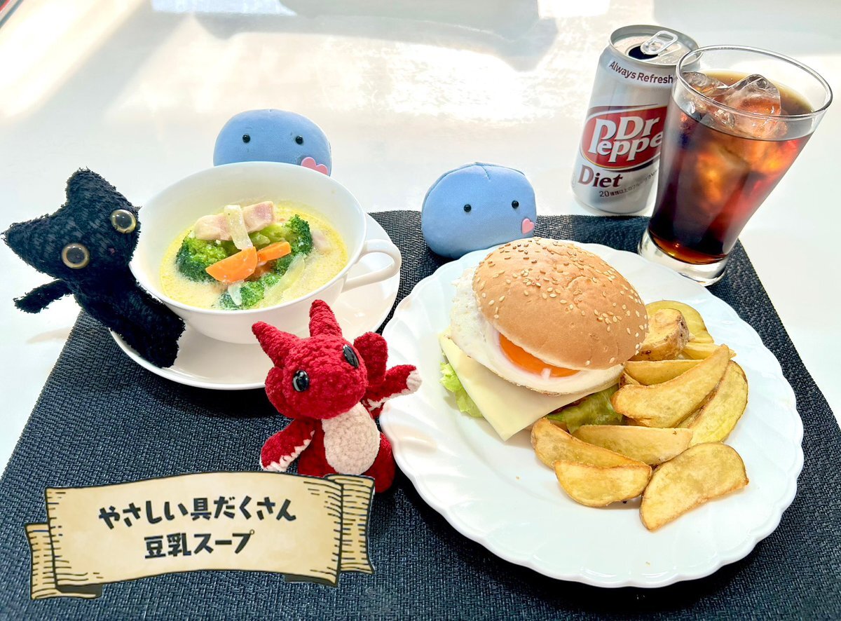 朝ごはん〜 朝から頑張った✨ やさしい具だくさん豆乳スープにコカトリステリヤキ月見バーガーっ!! 上から画像では厚みが分かりづらいのでズームアップ! 朝から食べる量ではないよう…な? いける?いけますか? 大丈夫〜っ!! スイちゃん達には心配ご無用のようです😅 #とんでもスキル再現料理 pic.x.com/bEE8SwexhS