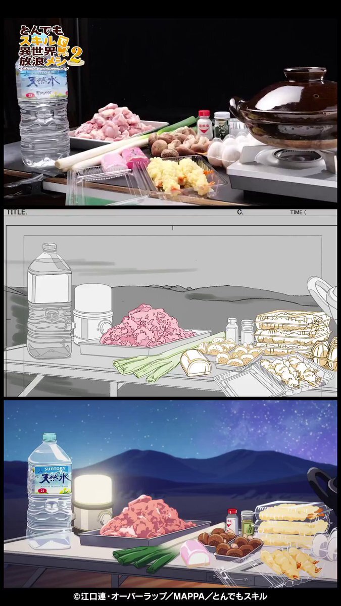 /  #とんでもスキルで異世界放浪メシ シーズン2   お料理シーン裏側🍳 \ 実写からアニメになるまでの貴重な比較映像✏️ 第17話より「ロックバード肉入り鍋焼きうどん」のシーンです🍴 ぜひ何度もご覧ください! #MAPPA #とんでもスキル #tondemo_skill