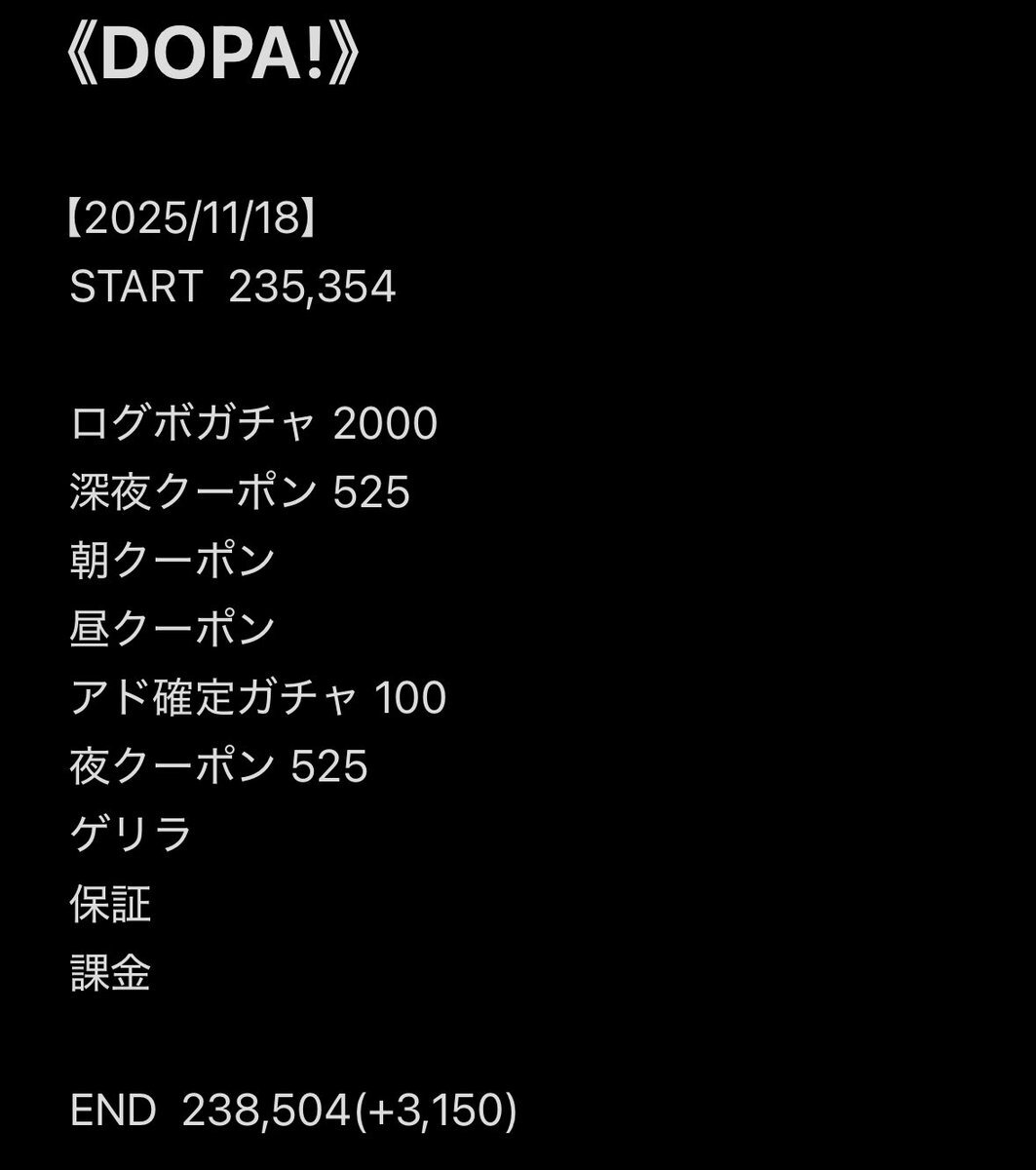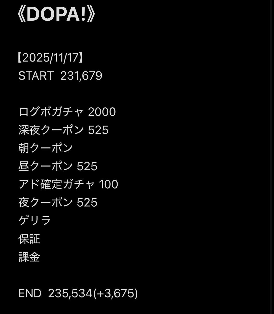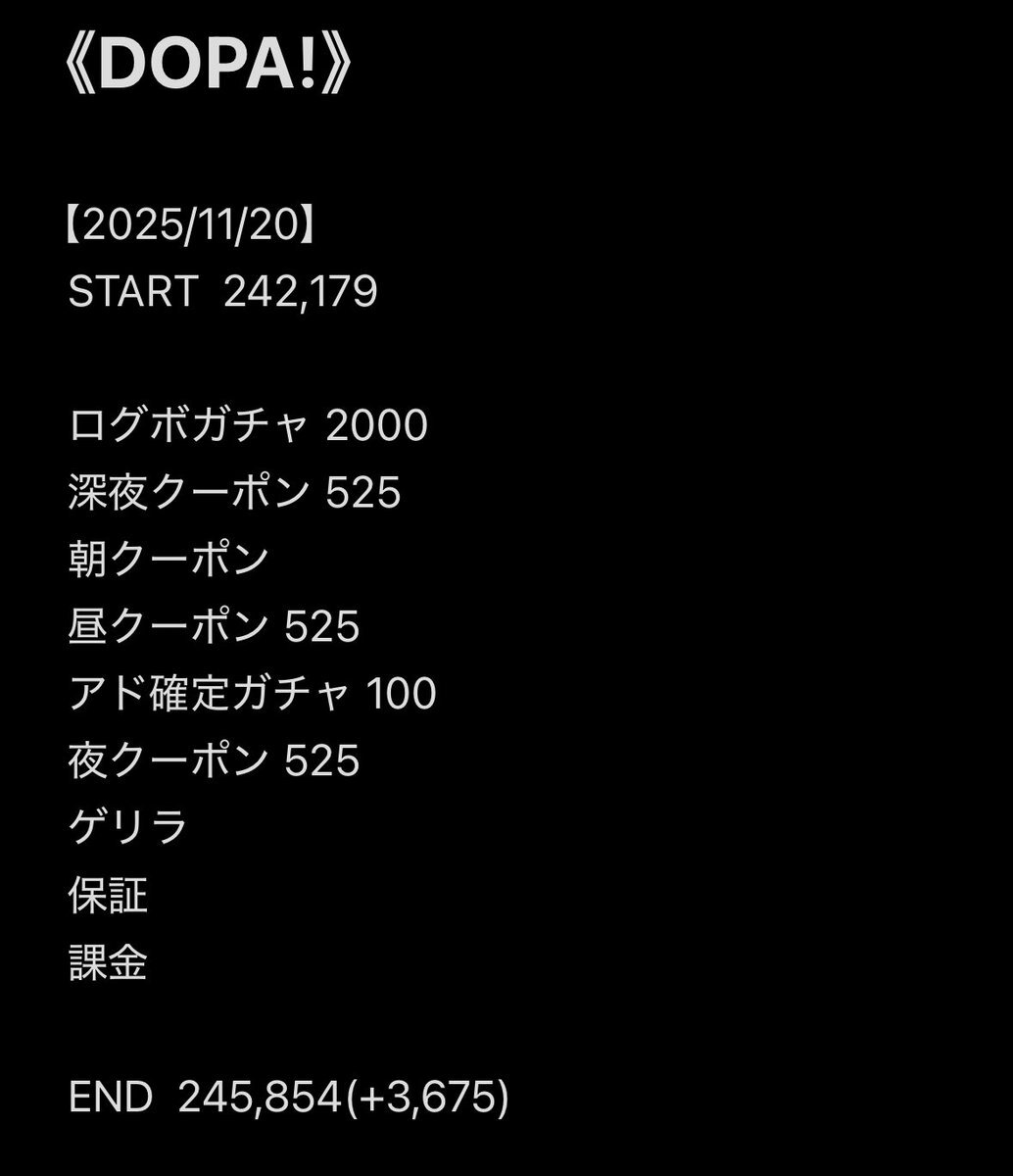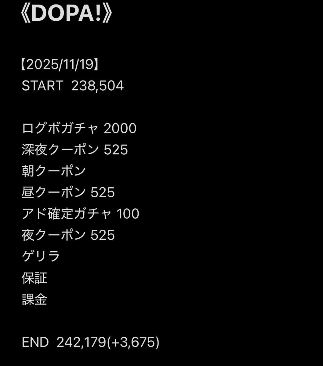 DOPA!のメモが撮れてなかったのですが、またログボ10分の1取れて結構増えました😌 しかし18時のアド確すら課金しないとになったのは今までにない改悪ですねー😭 #どんちゃん罰符 pic.x.com/mxg9hNJAdX