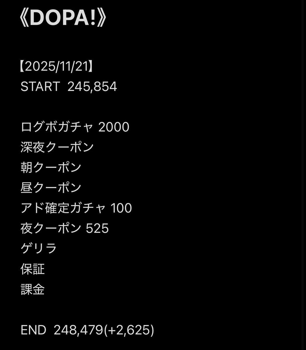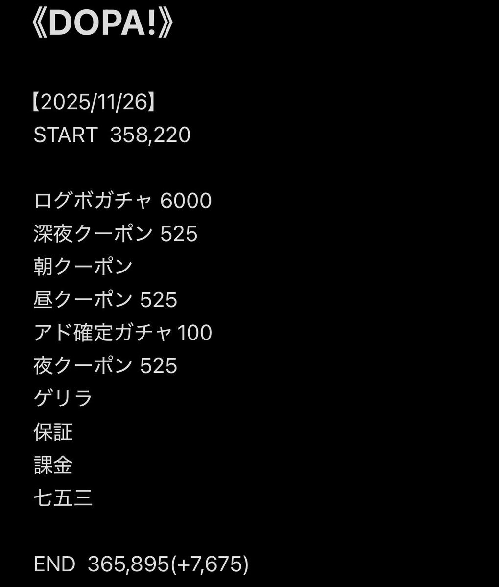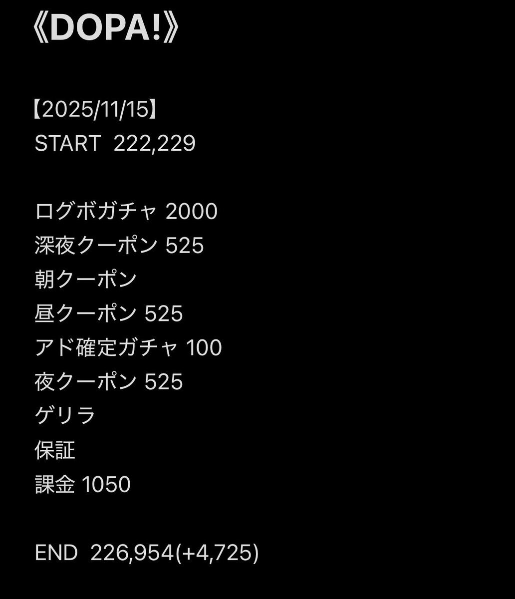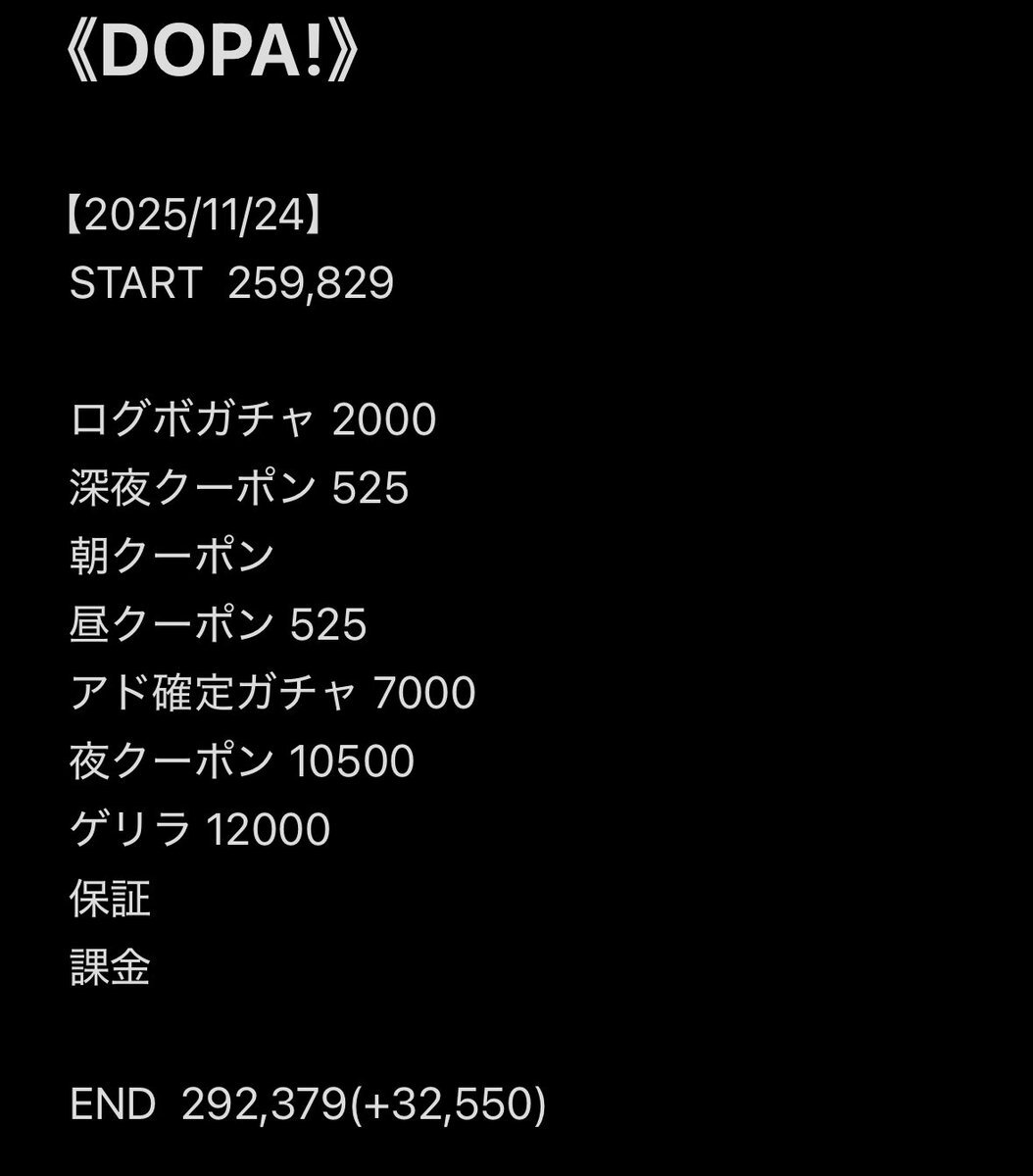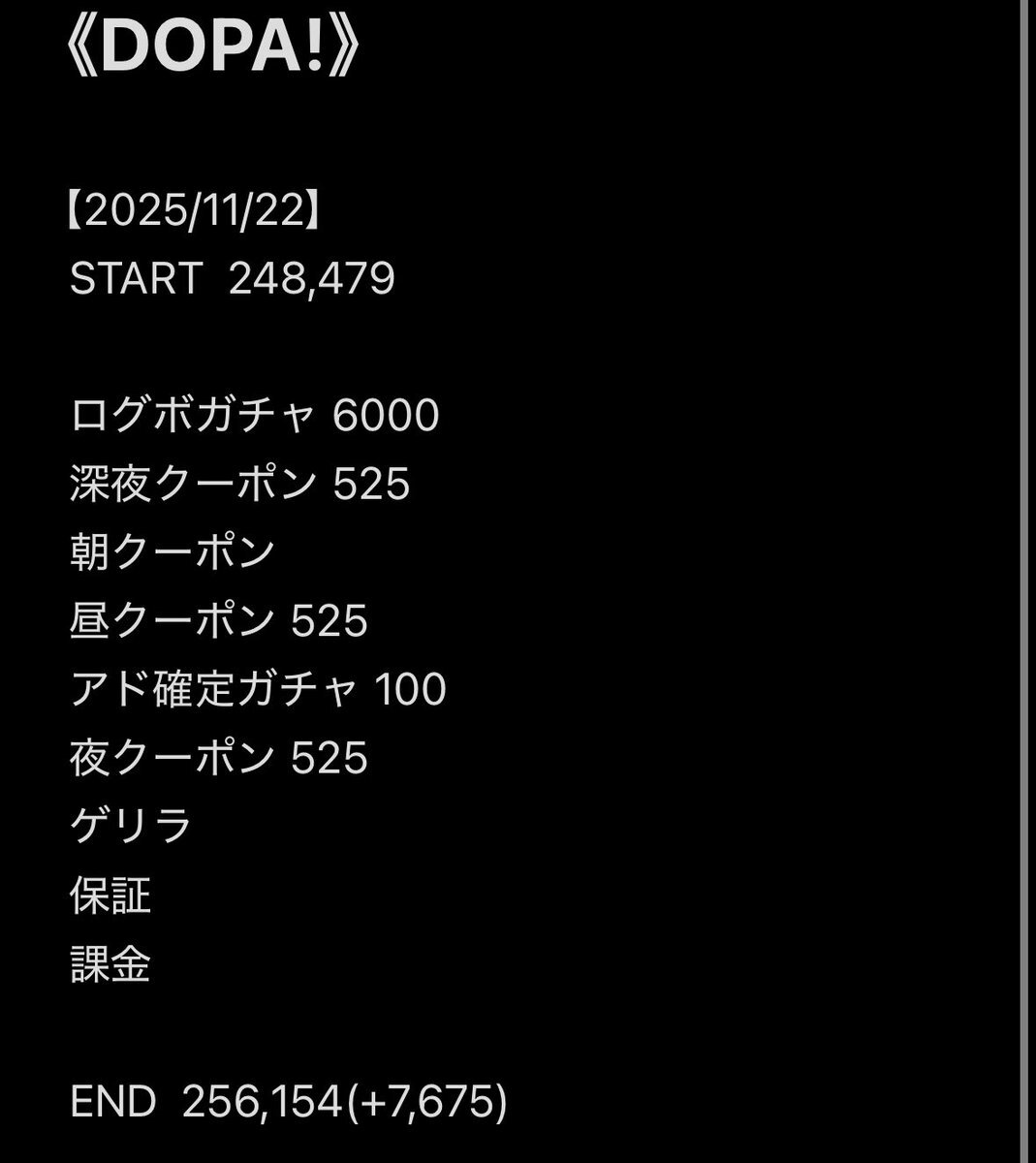 DOPA!のメモが撮れてなかったのですが、またログボ10分の1取れて結構増えました😌 しかし18時のアド確すら課金しないとになったのは今までにない改悪ですねー😭 #どんちゃん罰符 pic.x.com/mxg9hNJAdX