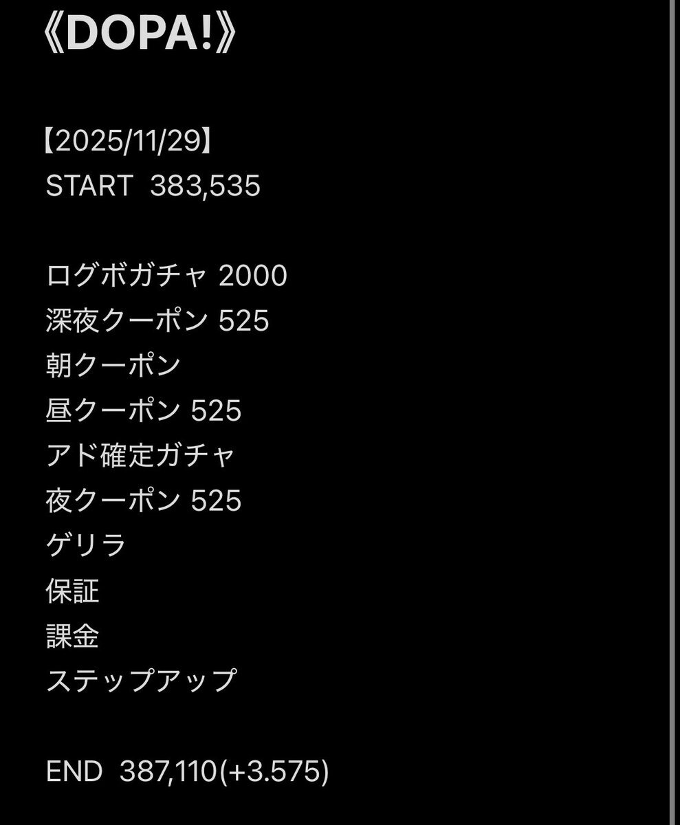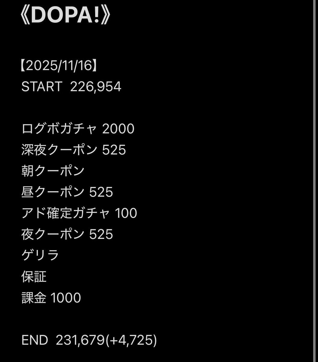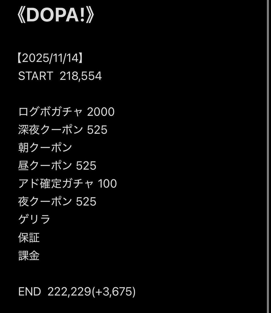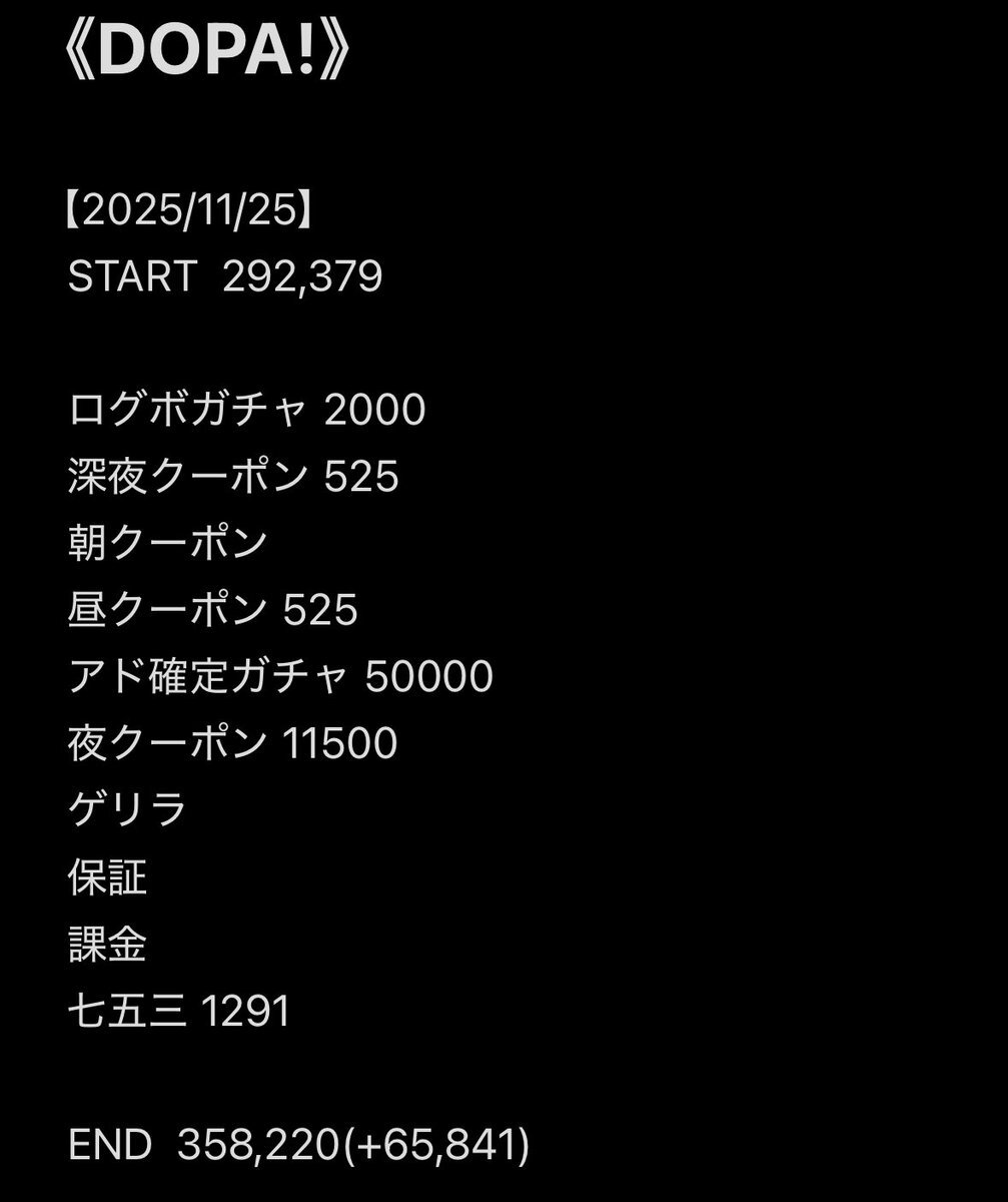 DOPA!のメモが撮れてなかったのですが、またログボ10分の1取れて結構増えました😌 しかし18時のアド確すら課金しないとになったのは今までにない改悪ですねー😭 #どんちゃん罰符 pic.x.com/mxg9hNJAdX