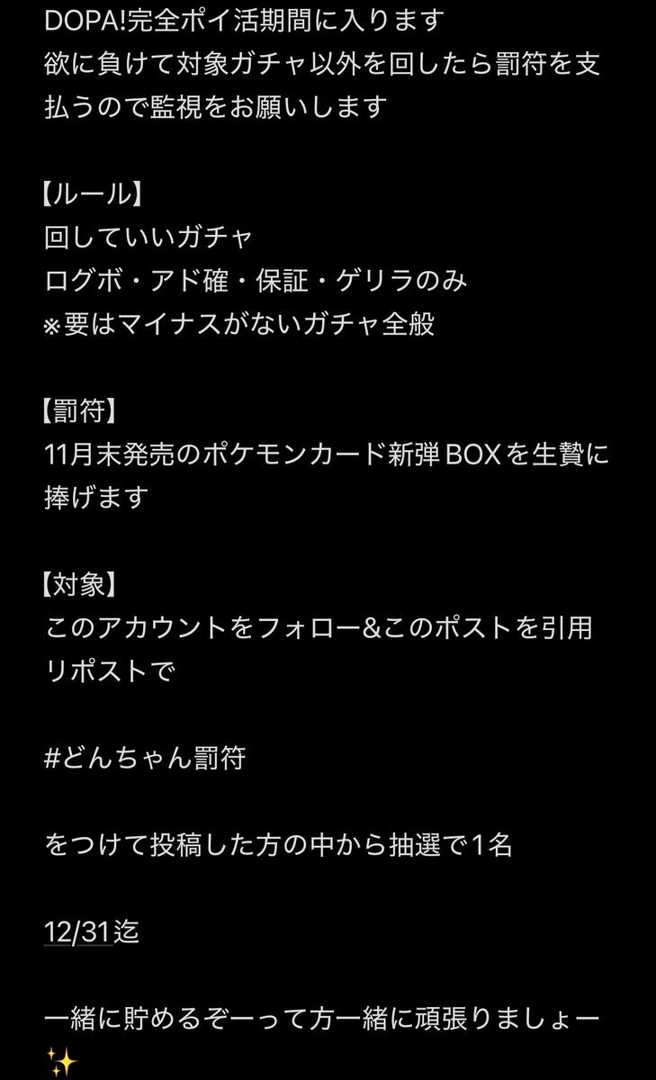 すぐに着火と暴走をするどんちゃんをみんなで監視しませんか😜 DOPA!で1回でもマイナスになるガチャを引いた瞬間罰符発動‼️ どんちゃんをフォローして #どんちゃん罰符 をつけてこのポストを引用リポストすればあなたも◯◯ゲットのチャンス!? 12/31迄貯めます✨ ※詳細は画像見てね