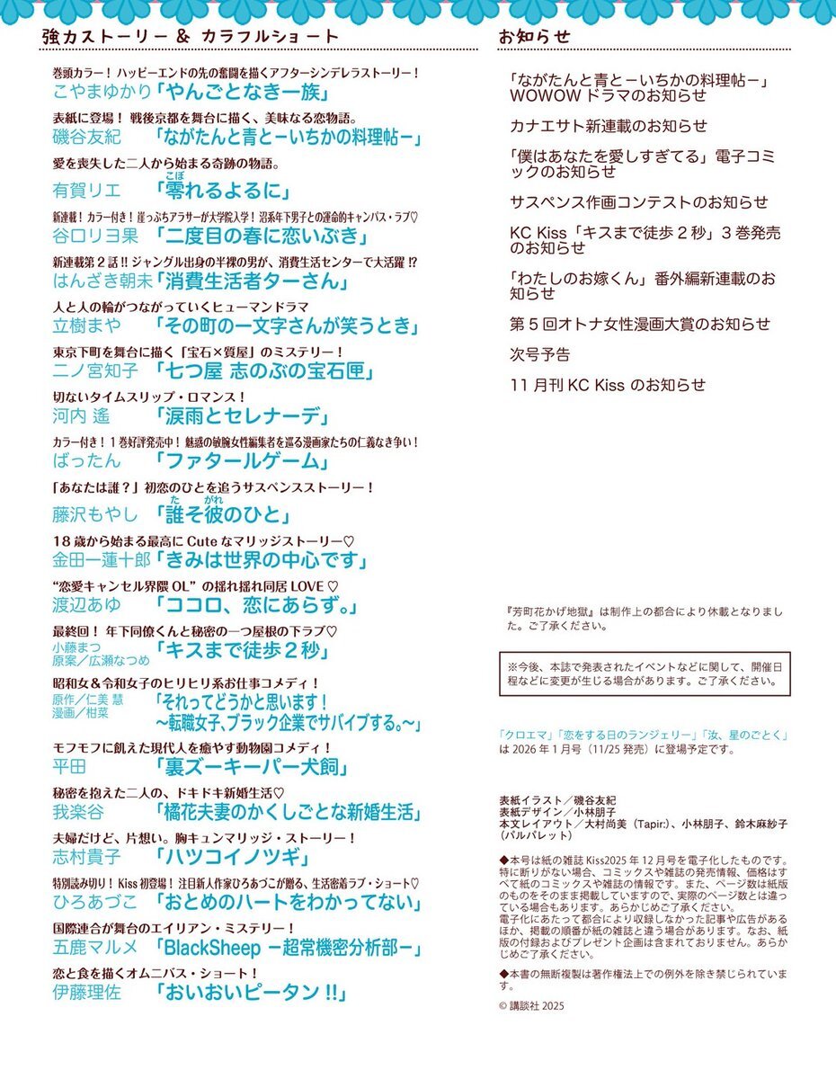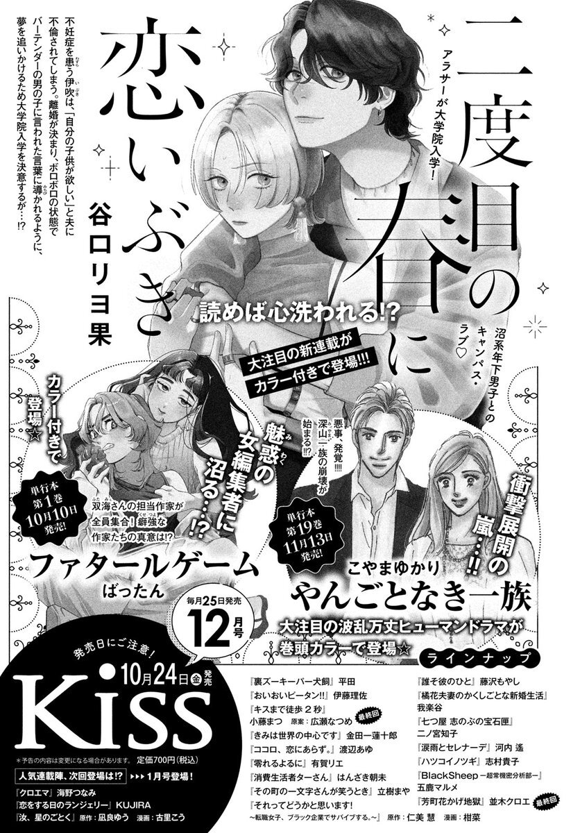 Kiss12月号が発売中💗 🥢表紙 #ながたんと青と 2026年春 ドラマ第2期決定✨ 💎新連載 #谷口リヨ果『#二度目の春に恋いぶき』 崖っぷちアラサー、大学院入学🎓 ✦カラー付き #やんごとなき一族 健太の兄・明人が警察に…!? #ファタールゲーム 漫画家たちの争いが本格化!? kisscomic.com pic.x.com/yBlUHpOtvO