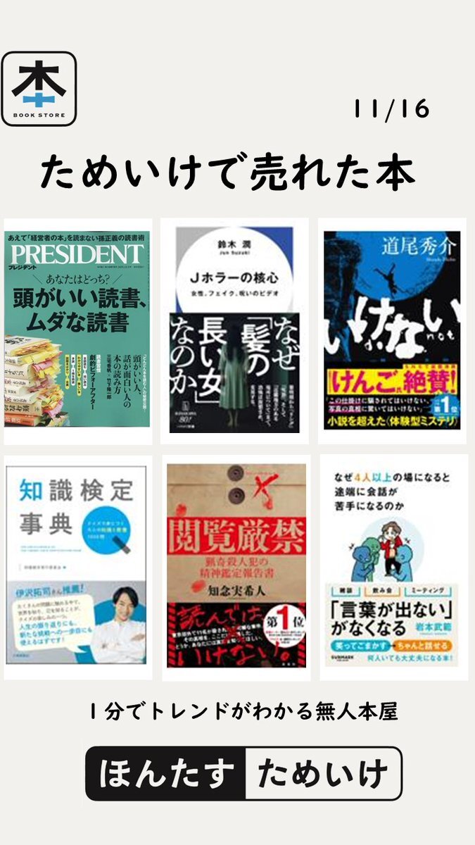 無人本屋 #ほんたす 11月16日🙂 「ぞうさんの日」 童謡『ぞうさん』作詞家まど・みちおさん誕生日 📖では昨日売れた本の紹介📖 #プレジデント 2025年 12/5号 #Jホラーの核心 #いけない #知識検定事典 #閲覧厳禁 猟奇殺人犯の精神鑑定報告書 #なぜ4人以上の場になると途端に会話が苦手になるのか pic.x.com/Wgzc7qt3SI