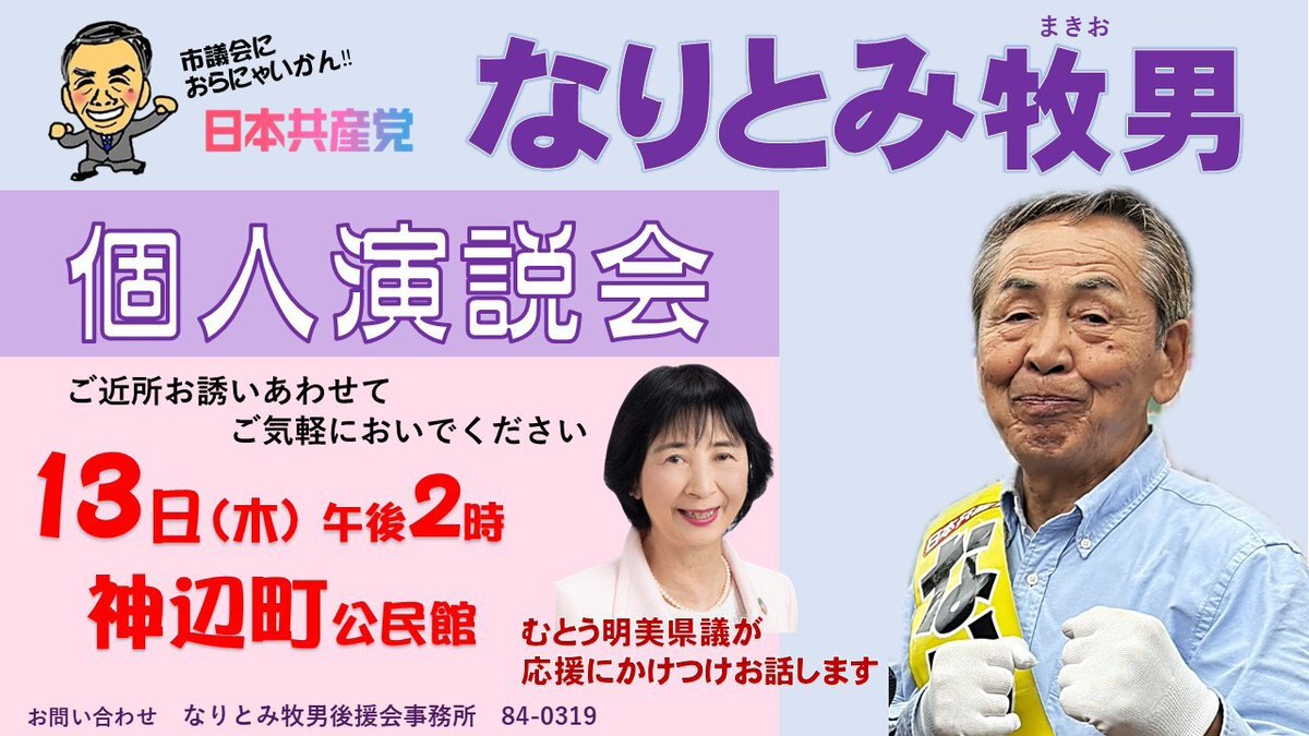 📢#なりとみ牧男 個人演説会のお知らせ 明日は地元・神辺で開催します! 🗓️11月13日(木) 午後2時から 📍神辺町公民館 #むとう明美 佐賀県議も応援にかけつけてくださいます! どなたでもお気軽にお越しください😊 みなさんの声を直接聞かせてください🤝 #鳥栖市 #鳥栖市議選 #鳥栖市議会議員選挙 pic.x.com/cej6sN5CMN