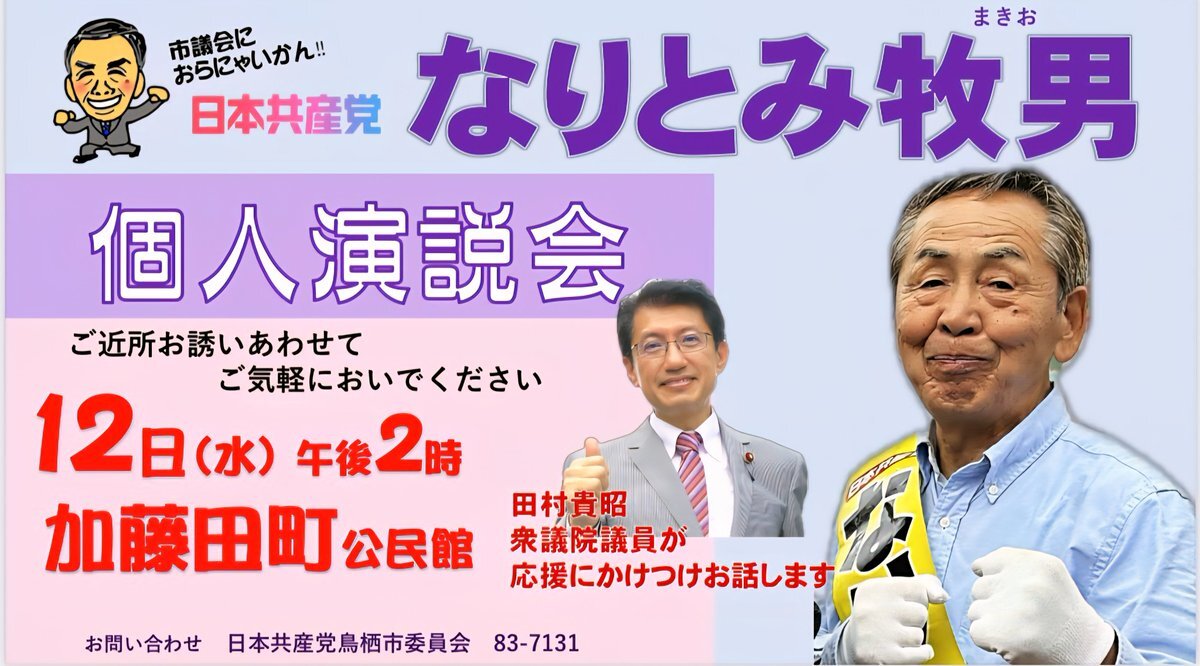 📢 #なりとみ牧男 個人演説会のお知らせ 🗓 11月12日(水) 午後2時から 📍 加藤田町公民館 #田村貴昭 衆議院議員も応援にかけつけます! みなさんと一緒にお話できる時間です✨ ご近所の方もぜひ一緒にお越しください😊 #鳥栖市 #鳥栖市議選 #鳥栖市議会議員選挙 pic.x.com/jGt0VKprl5
