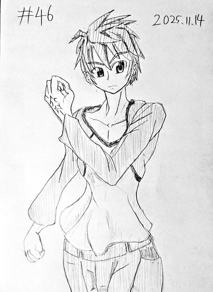 #なんでもいいから1日1枚描く 第46回 『Fate/stay night』より、衛宮士郎です。 ポーズが思いつかなかったので丸写しにしました。丸写しでコレかよ。 首や鎖骨の表現にはこだわりました。 短髪って描くの難しいですね。 pic.x.com/IVbNL9oPTf