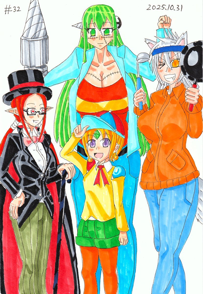 #なんでもいいから1日1枚描く #ハロウィン 第32回は拙作『Lichに逝こうよ』の4人で怪物くんコスです。 ドラキュラとかは資料によってけっこうカラーリングがまちまちでしたが、まあ着替えてるってことなんでしょうね。 pic.x.com/JyKtYp7IYn x.com/sou123houseisa…