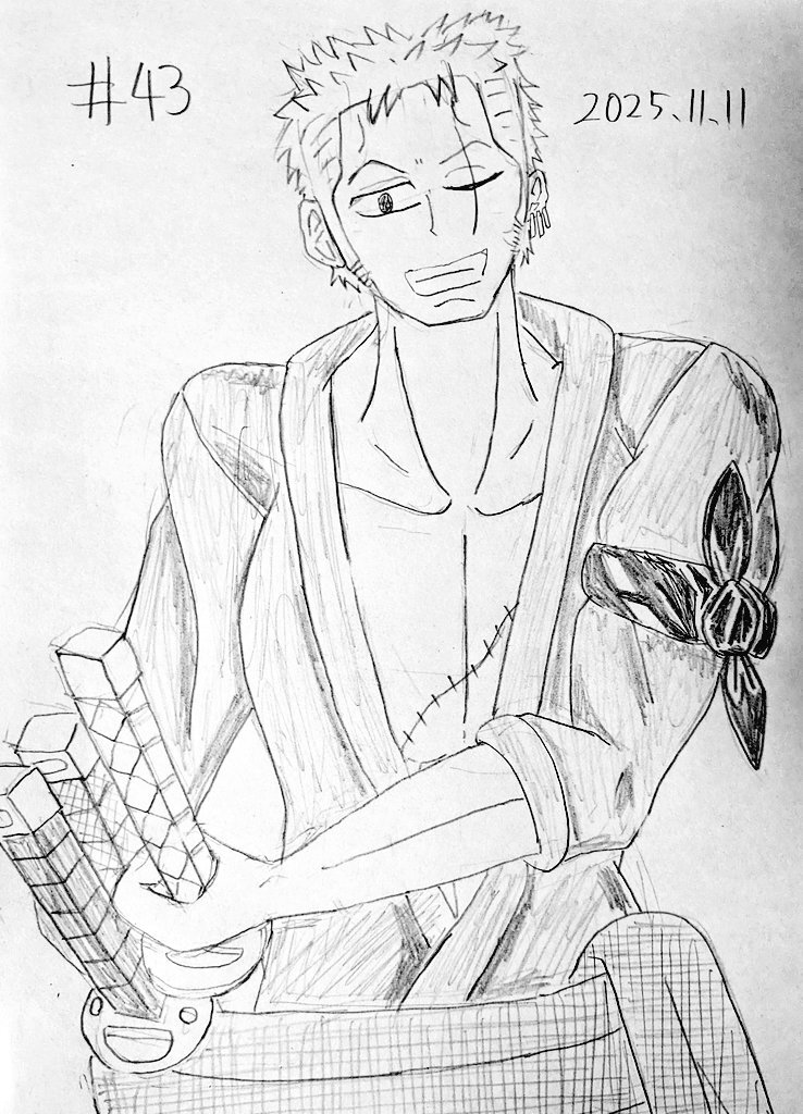 #なんでもいいから1日1枚描く #ロロノア・ゾロ誕生祭2025 第43回 『ONE PIECE』より、ロロノア・ゾロです。 刀3本も描くのは大変でした。あと意外と描きにくい髪型と顔で苦労しましたね。 ゾロは一味の中で一番好きなキャラです。俺もゾロみたいな男気のある漢になりたいです。 pic.x.com/7eKmpjIujM