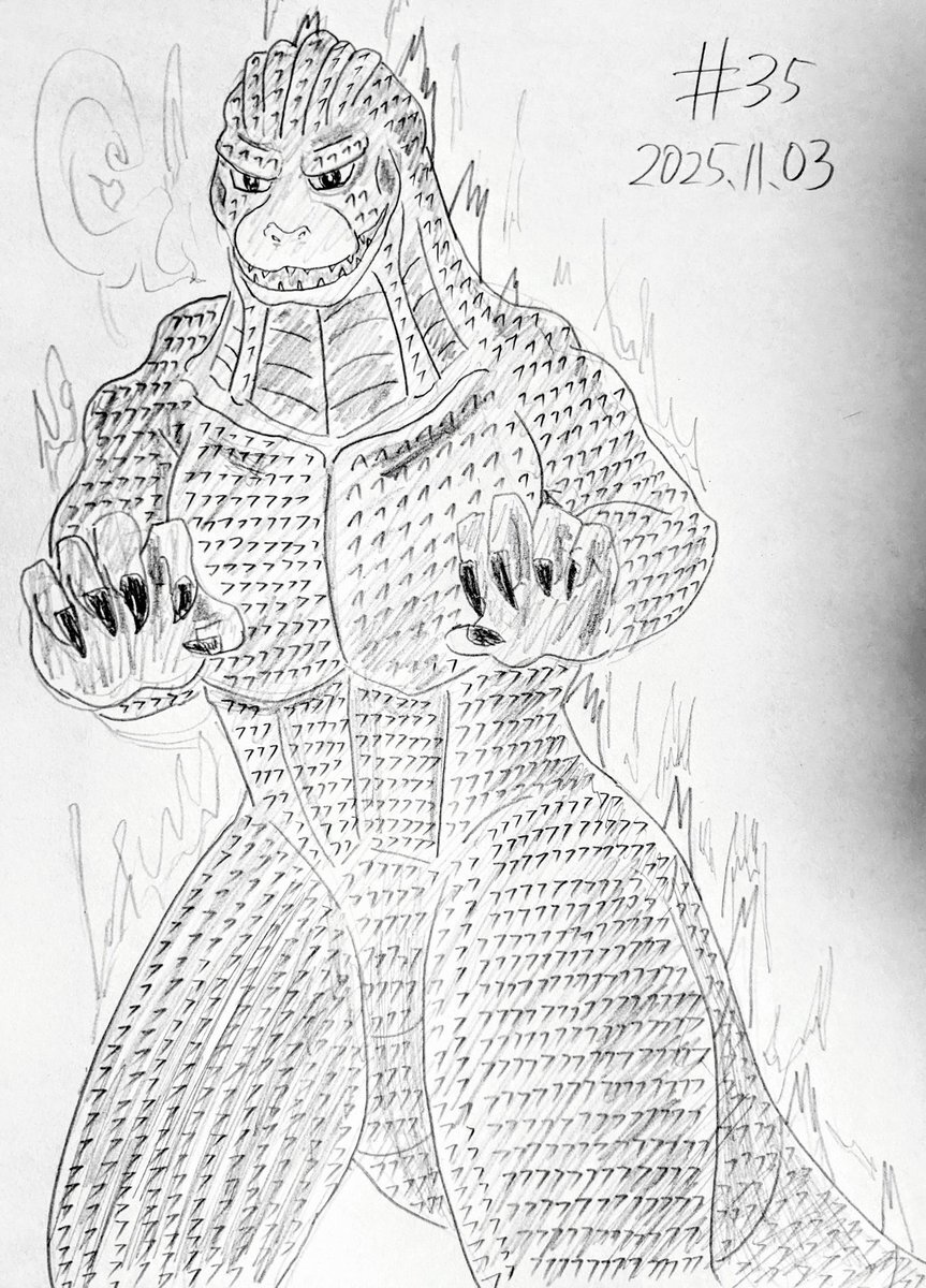 #なんでもいいから1日1枚描く #ゴジラの日 第35回はゴジラです。 ウロコ描くのがめちゃくちゃ大変でした。一応マイゴジの画像を見ながら描いたつもりなのだが、自分でも一体どのゴジラなのか分からなくなってきた。 pic.x.com/MNdSVEjkXU