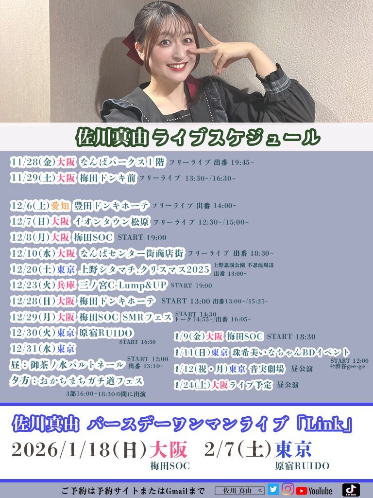 25.11.28 #なんばパークス #佐川真由(33回目)@mayu_n0117 ・with 🔽①PiNKY NAiL(#珠希美いな さん作) 🔽②Capter 🔽③the Begining 2ヶ月ぶり…やっと会えた! 珠希さん提供の新曲かわいかった🥰撮影OKって聞いてせっかくやし撮ってたけど、Chapterは抑えきれんかった🔥٩( ᐛ )وカメラ目線おおきに〜 pic.x.com/kOllOwa1gb x.com/leoguitar_hach…