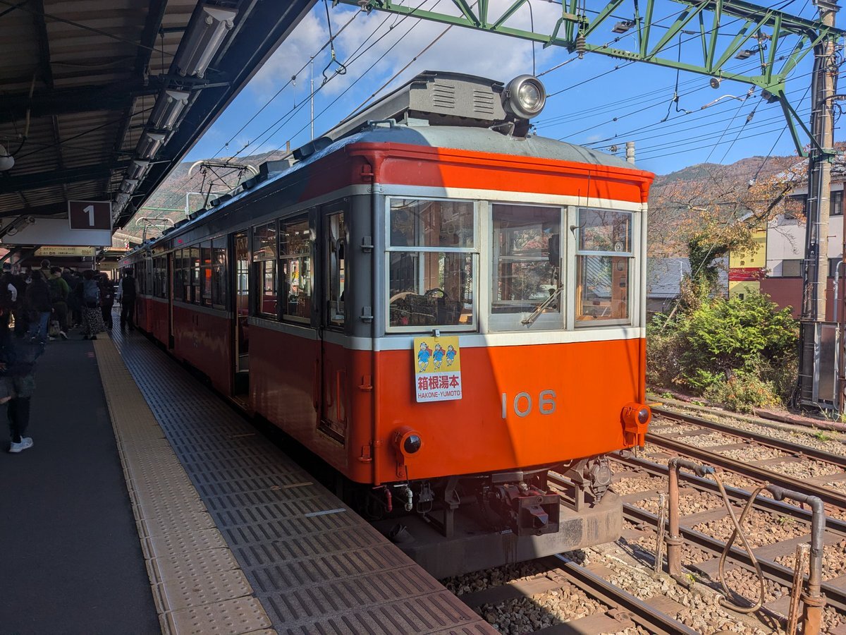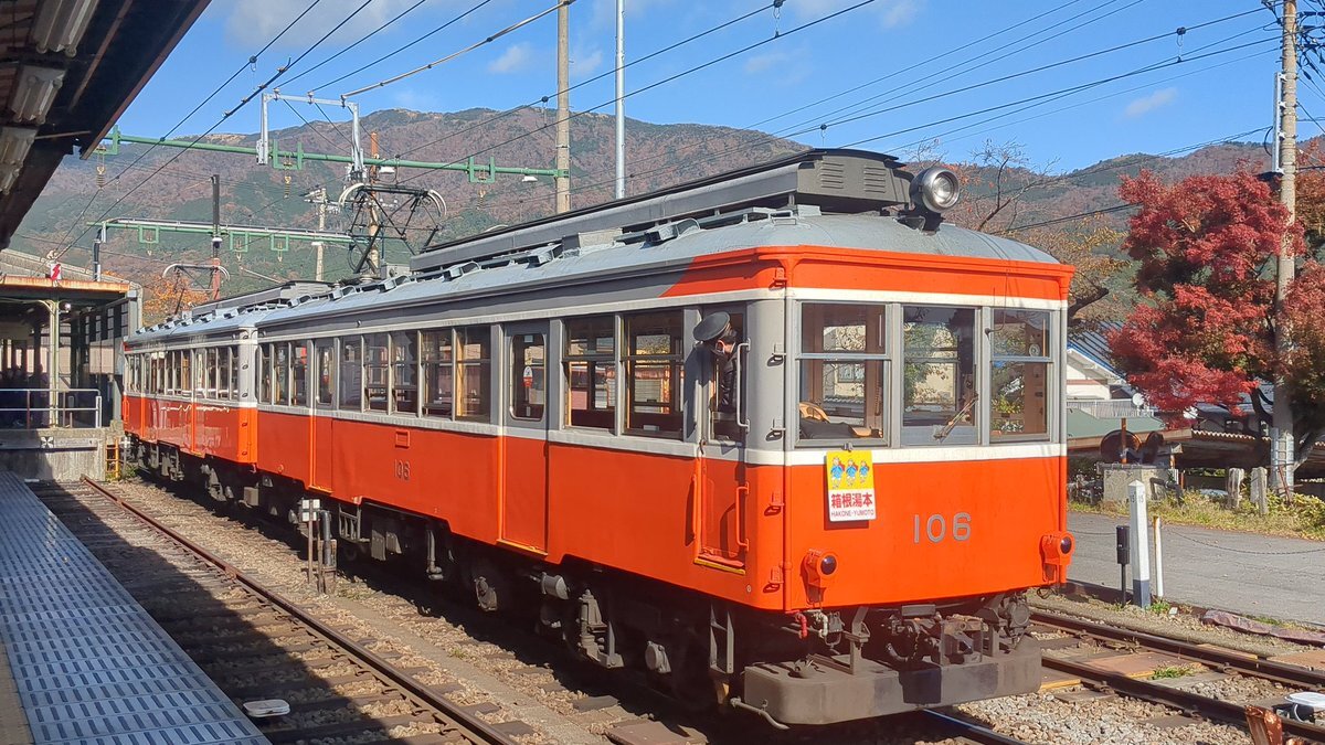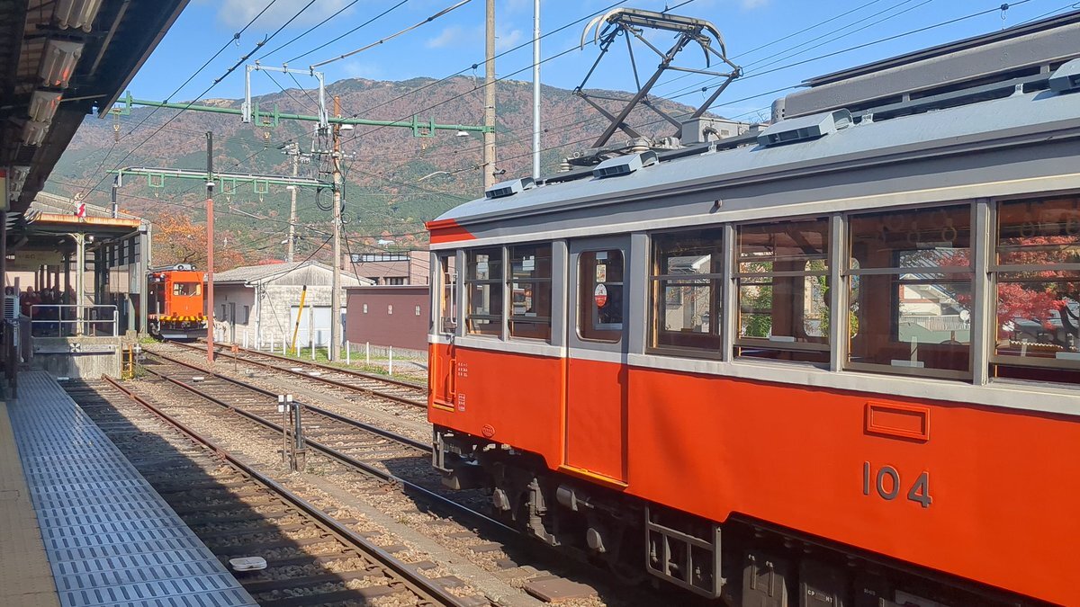 【一昨日の箱根旅行 その4】 #にゃんちき写真展 箱根湯本駅から40分程、強羅(ごうら)駅に到着。 ここでようやく乗っていた電車の写真をまともに撮れる時間を作れた。 噂によると最近はこの形の電車が2両で走っている姿は結構珍しいらしいが、真相は如何に。 pic.x.com/F4xhVlb1S4