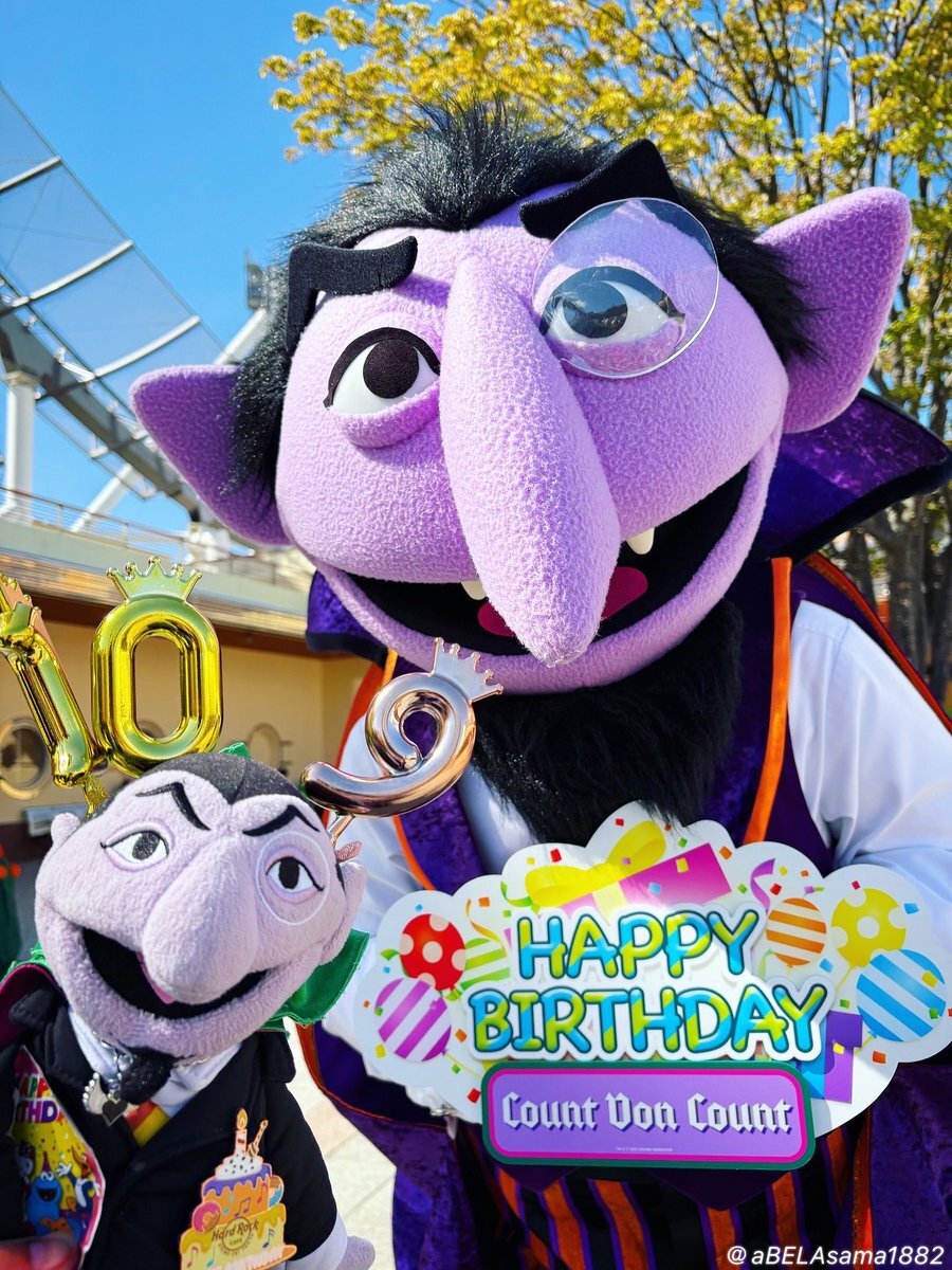 #本日のカウント伯爵 10/9 今日の数字は🔟と9️⃣AHAH AH〜⚡️🦇かりんとちゃんは伯爵のお誕生日お祝いしに行ったよ〜🦇💜🦇💜🦇💜🦇💜🦇💜 #ぬいぐるみと撮り隊 #なーにしてるのかなカウント伯爵 #カウント伯爵の魅力を伝えたい #USJファン #カウント伯爵 pic.x.com/Hx6fY7twT5