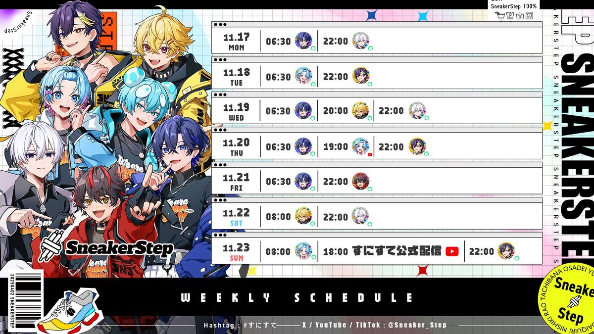 ◥◣✨👟すにすて -𝐒𝐧𝐞𝐚𝐤𝐞𝐫𝐒𝐭𝐞𝐩-👟✨◢◤   👟11/17(月) ➡ 11/23(日)📱 👟今週の配信スケジュールを公開🗓 👟11月に突入…    初ワンマンまであと少し。 👟 レッスンや準備の秘話が   配信でこっそり聞けるかも…? 👟今週も、メイツと共に、𝐒𝐭𝐞𝐩👟💨 #すにすて