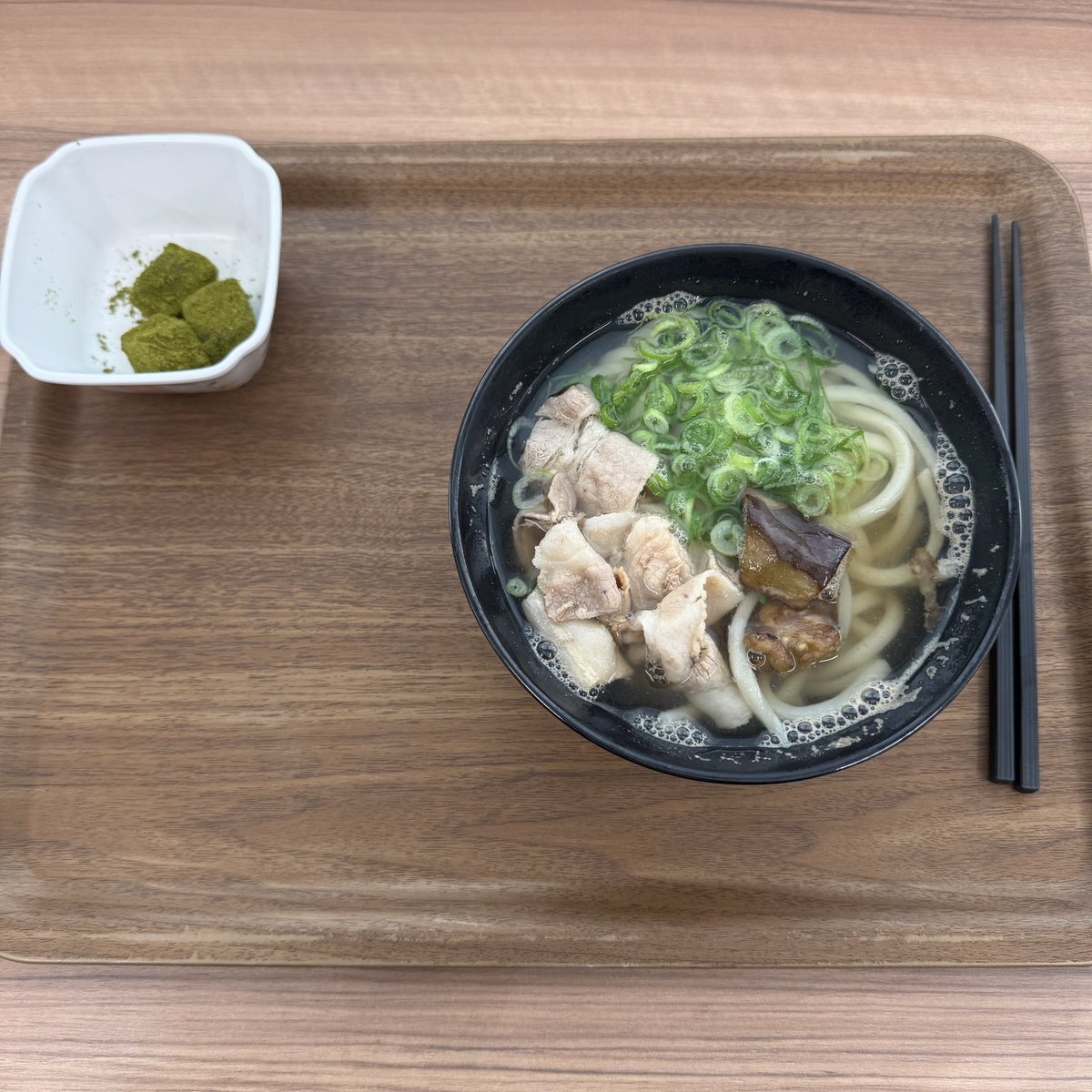 いつもの物流倉庫で豚肉うどん🐷 300円 うどんの汁が関西だしの味でここは大阪なのだと実感する あと抹茶きなこもちは抹茶苦手な自分でも食べれた #うらっこ飯テロ部 #ねき今日これ食べたよ見て pic.x.com/rhtCKkdUaM