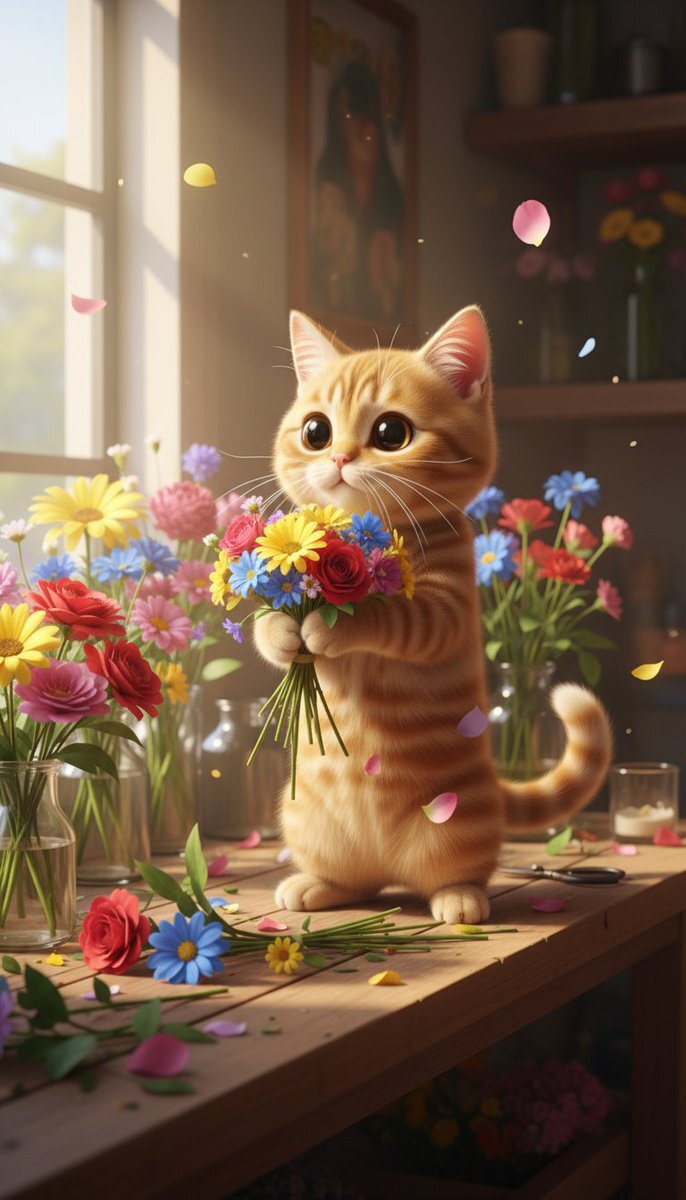 今日は花屋としてがんばるマロン。やさしい一日でした。 Today Maron worked as a florist — a calm and gentle day. #ねこのおしごと日記 #CatWorkDiary #MaronCat #猫動画 #CatVideo #AI動画 #花屋猫 #FloristCat #X動画 #癒し猫 pic.x.com/6iRK4wIntr
