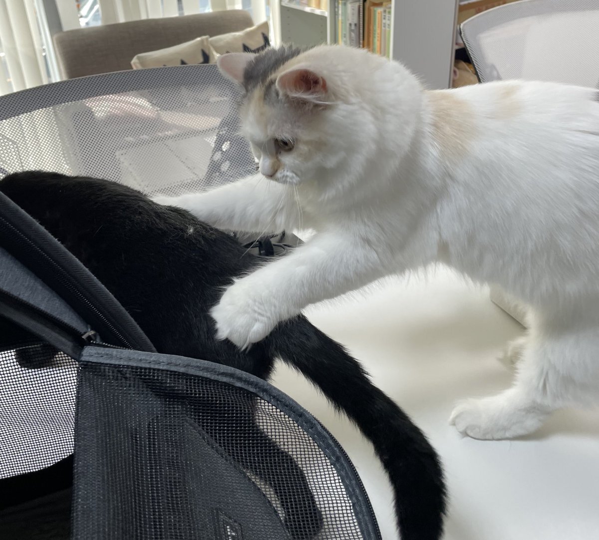 まぐろにちょっかいを出すエミリ🎀 #ねこぱんち神戸三宮 pic.x.com/134qRDEFZx