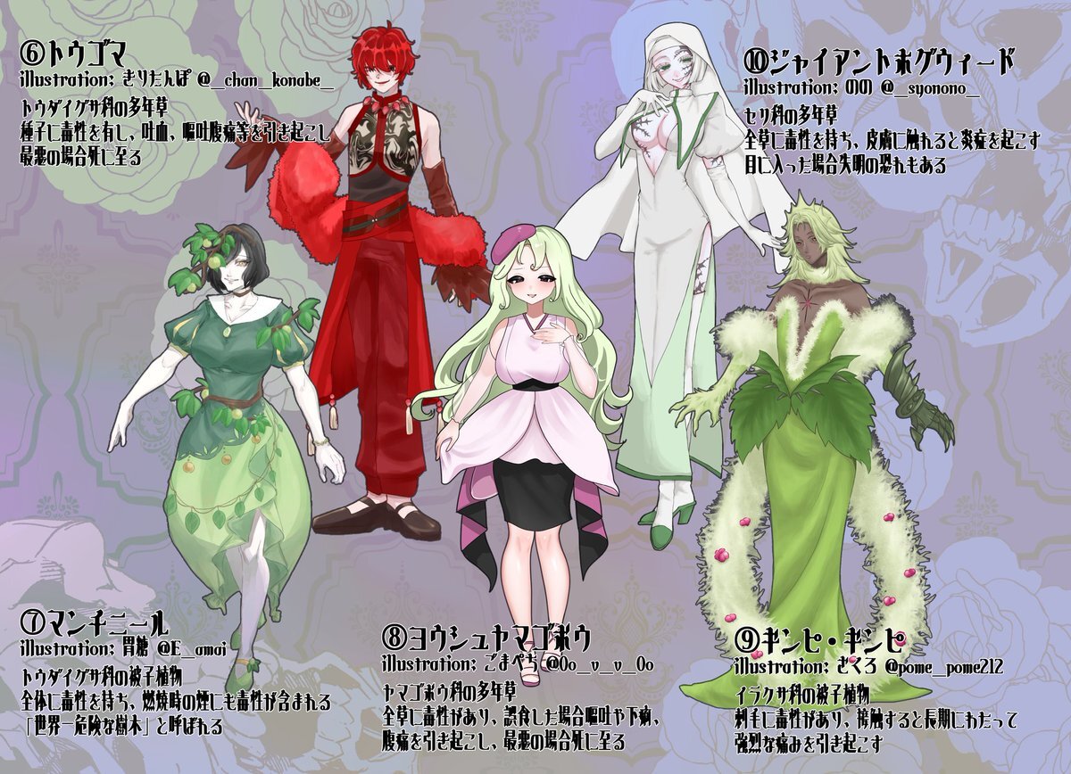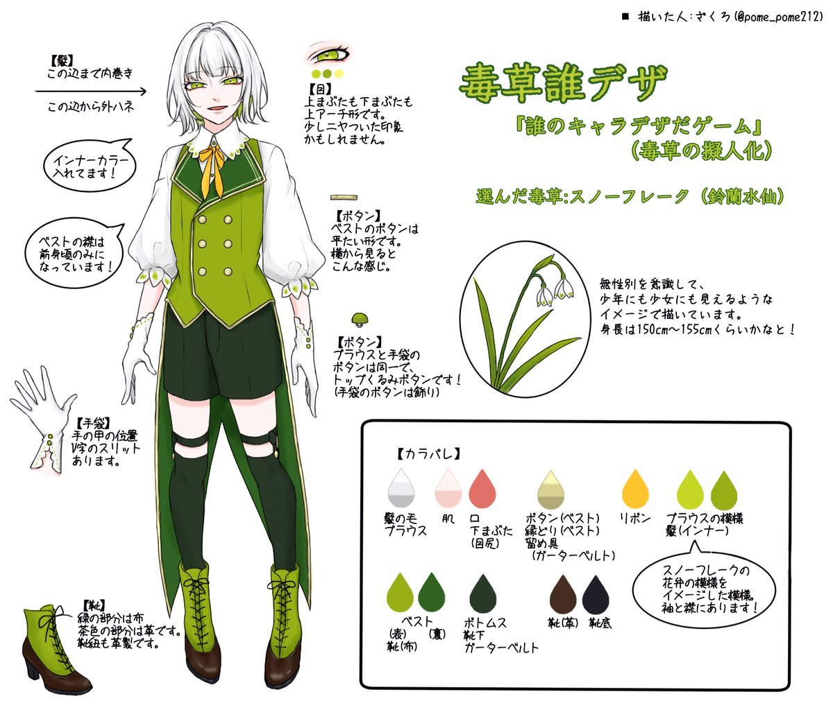 のの(@_syonono_ )さん主催の誰デザに参加させて頂きました!! テーマは『毒草擬人化』☠️🌿 自分は「⑤スノーフレーク」のイラストを担当させて頂きました!!どれが□のデザしたキャラなのか、予測してみてちょ〜!! #ののの毒草誰デザ