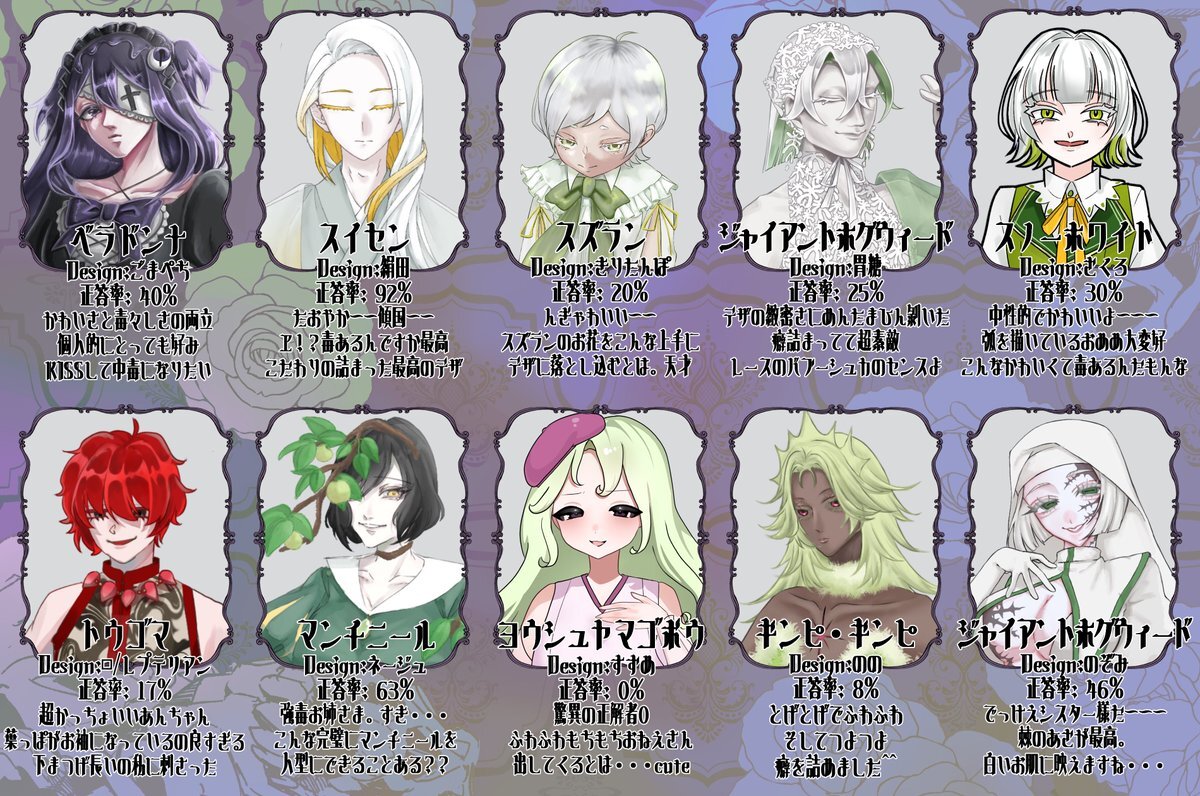 #ののの毒草誰デザ 答え合わせ‼️ ネージュの担当は⑦マンチニールでした‼️‼️植物生やしてる人他に居なくて爆焦りしましたが、正答率62%でギリ耐え!と思ってたのに答えられランキング2位とは何事ですか みなさんありがとうございました💚 pic.x.com/3w5O64LZAw x.com/neige_chikuwa_…