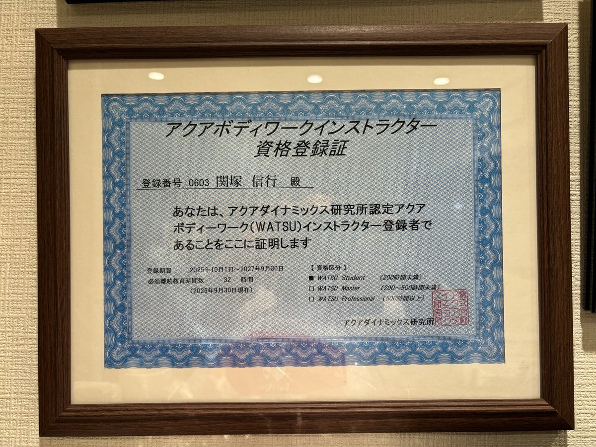 アクアボディワークインストラクター資格登録証 無事に更新❤️ 更なるレベルアップを目標に頑張るぞ〜💪😤 ワッツ最高😍💯 #のぶ整体院 #のぶ整体院7周年記念 #国分寺 #恋ヶ窪 #ワッツ pic.x.com/GWK4vlG2mt
