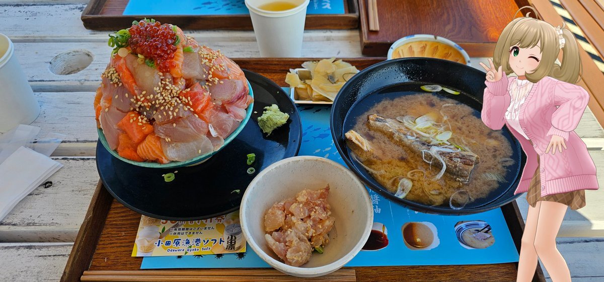 昨日の小田原日帰り旅行 まず早川の漁港の駅totoco小田原へ 2Fの「とと丸食堂」でランチ☀️🍴 食券購入に時間かかってる感じで並んでた とと丸頂上丼 本日のなめろう あら汁 見た目楽しい 味も○ 魚介出汁がめっちゃ濃厚で美味しかったʚ♡ɞ #デレスポAR #アイマスP食いしん坊隊 #はぁとのごはん #佐藤心 pic.x.com/tiSMMdHpuK