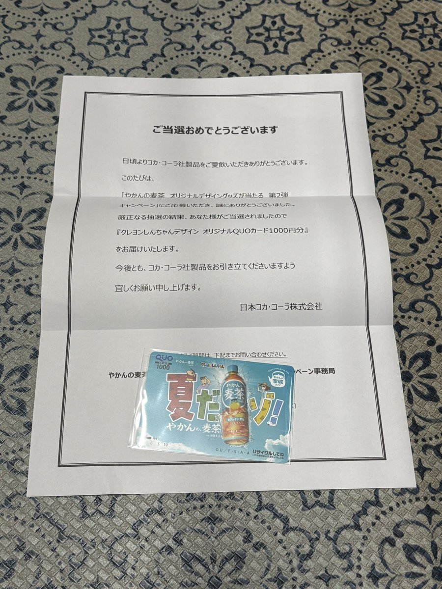 10/25に届いてたけど放置されてた😛 やかんの麦茶オリジナルデザイングッズが当たる第2弾キャンペーン当選品クレヨンしんちゃんデザインオリジナルQUOカード1000円分 #はくふの懸賞当選品 #クレヨンしんちゃん #やかんの麦茶 #QUOカード pic.x.com/ISxa9udEh8