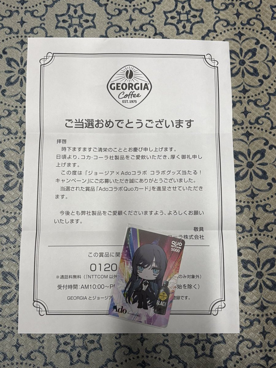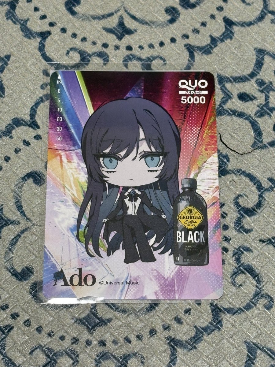 9/18に届いたコカコーラジョージア懸賞当選品adoのQUOカード❤️ 他の柄も当てたいけど、今のところ全然ダメ😂 #はくふの懸賞当選品 pic.x.com/j7uMKkQDKw