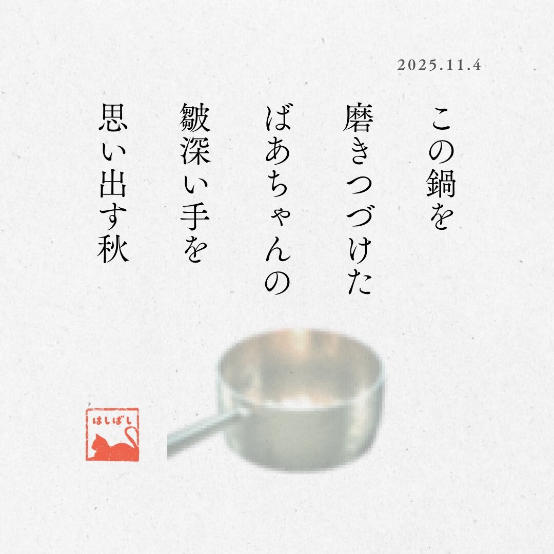 この鍋を磨きつづけたばあちゃんの 皺深い手を思い出す秋 #はしばし短歌 pic.x.com/OA0yf7pUjr