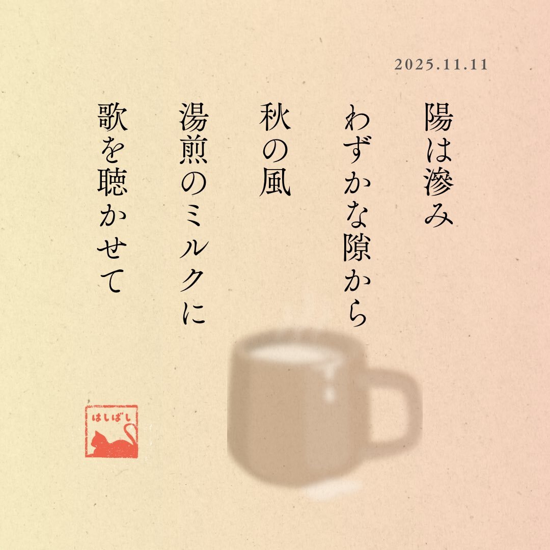 陽は滲みわずかな隙から秋の風湯煎のミルクに歌を聴かせて 🔖 #11月11日の創作 #短歌 #今日の創作 #はしばし短歌 pic.x.com/H7JPQ7yEhn x.com/tankazine/stat…