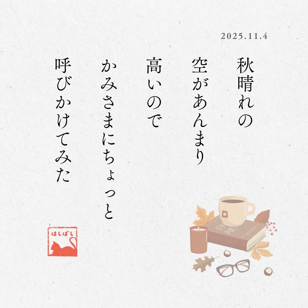 秋晴れの空があんまり高いので かみさまにちょっと呼びかけてみた #はしばし短歌 pic.x.com/QU9f2QtlYe