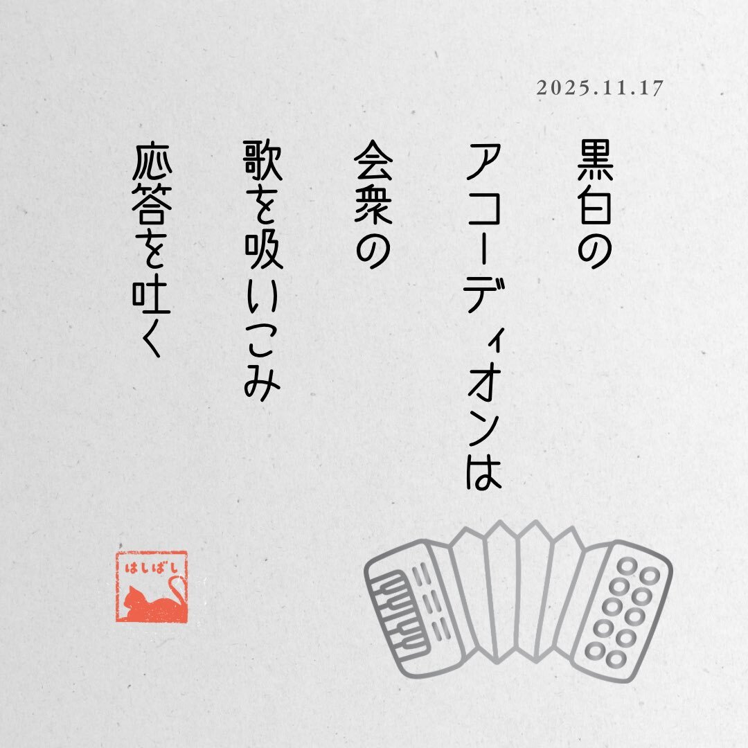 黒白のアコーディオンは会衆の 歌を吸いこみ応答を吐く #11月17日の創作 #短歌 #今日の創作 #はしばし短歌 pic.x.com/PYeS2aUosi x.com/tankazine/stat…