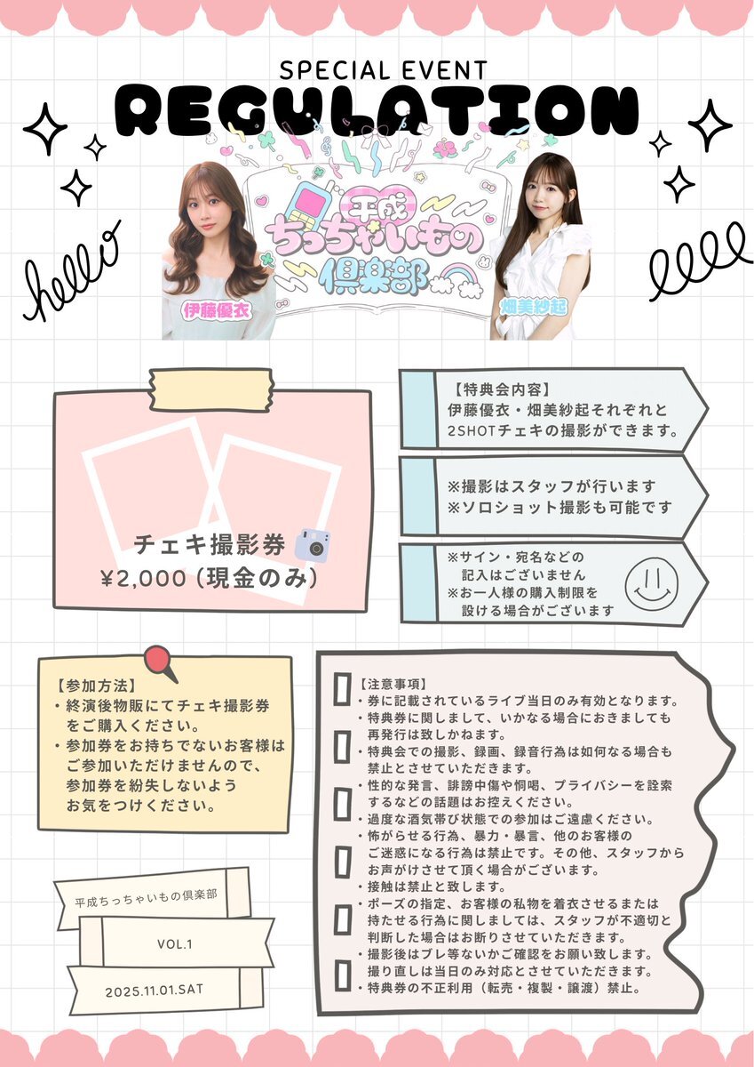 『平成ちっちゃいもの倶楽部』#1 11月1日(土)ついにあした💗💗 tiget.net/events/436963 あした終演後の特典会の詳細です📸✨ 2shotチェキが撮れます🫶🏻パジャマ 特典会の内容も今後いろいろ考えて やっていきたいと思ってます🐇 x.com/wallop_3_0/sta…