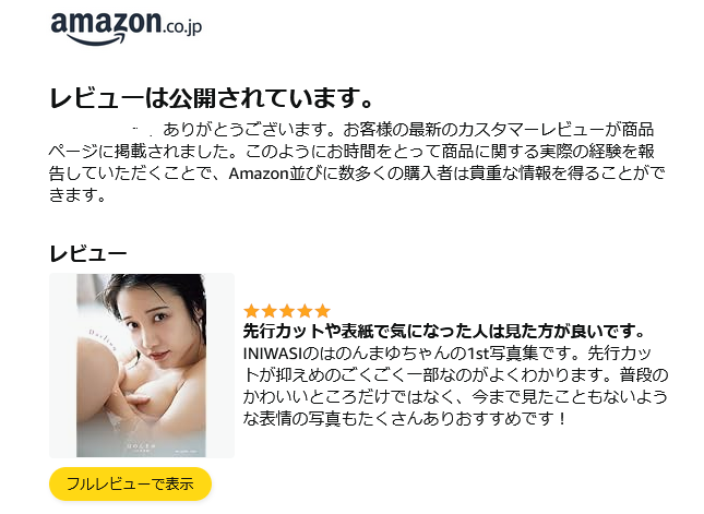 レビューするとアマゾンからメールくるのね 公開されました #はのんまゆ #はのんまゆ1st写真集 pic.x.com/I6kHRh6EMT