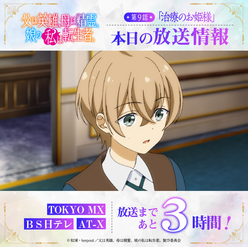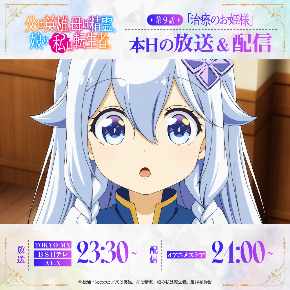 ⋆⸜#ははのは 本日の放送&配信情報⸝⋆ 第9話「治療のお姫様」 💠TOKYO MX 23:30~ 💠BS日テレ 23:30~ 💠AT-X 23:30~  ※リピート放送 毎週木曜/翌週日曜 💠dアニメストア 24:00~ TVアニメ『 父は英雄、母は精霊、娘の私は転生者。』 第9話は本日より放送開始✧*。 pic.x.com/T1ogJqXRpY