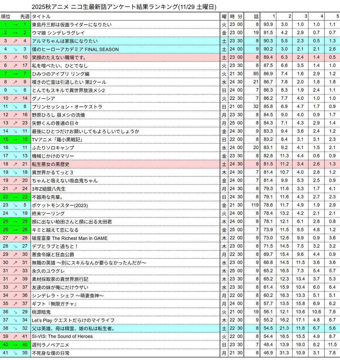 2025秋アニメ ニコ生最新話アンケート結果ランキング(11/29 土曜日) 🥇アルマちゃんは家族になりたい 8話 🥈僕のヒーローアカデミア FINAL SEASON 9話 🥉笑顔のたえない職場です。8話 ・土曜更新分(#アルマちゃん #ヒロアカ #えがたえ #転生悪女の黒歴史 #ははのは) pic.x.com/bdaKvcXgHE